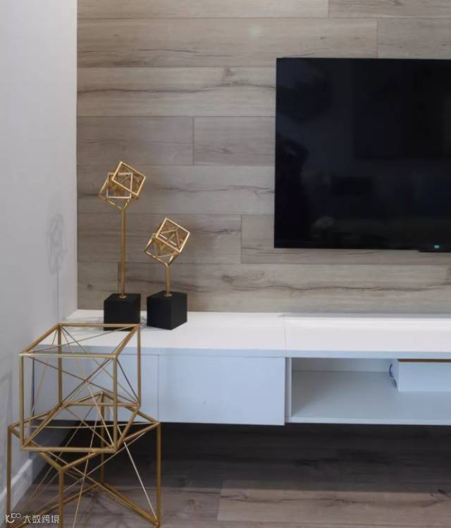 将木色地板铺贴上墙的方式,打造出自然有温度的电视背景,白色架空电视柜,简约的同时也让地面赋有延伸感。
