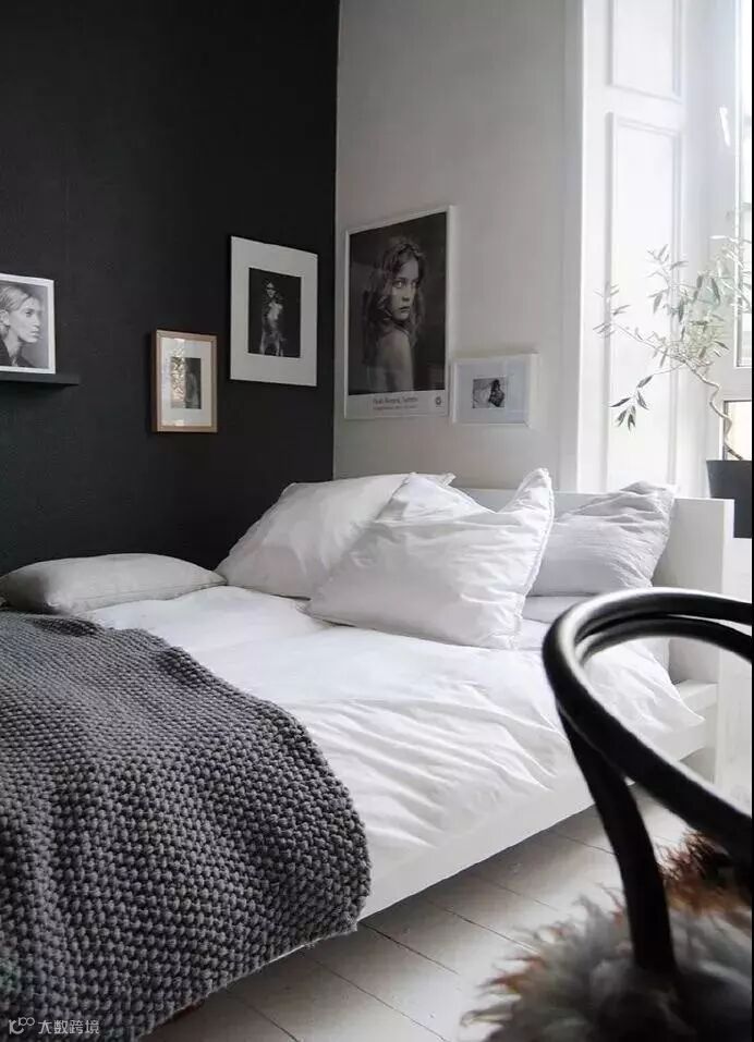 ▲ 以墨绿色为基调的墙壁,白色床单纯粹而安然,与墨绿色的搭配既不会抢夺空间的主动权,又会使空间更加淡雅自然。