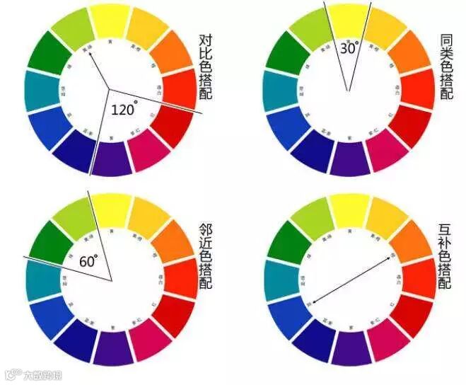 如对比色有:黄和蓝、紫和绿、红和青、任何色和黑白灰、深色和浅色、冷色和暖色、亮色和暗色等;互补色有:红与绿、橙与蓝、黄与紫等。