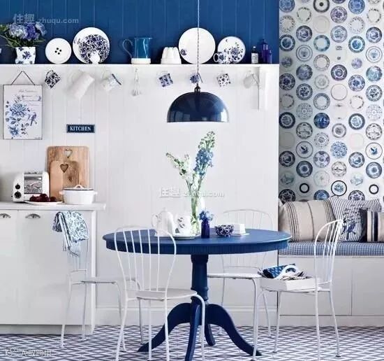 但不宜用在餐厅或是厨房,蓝色的餐桌或餐垫上的食物,总是不如暖色环境看着有食欲;