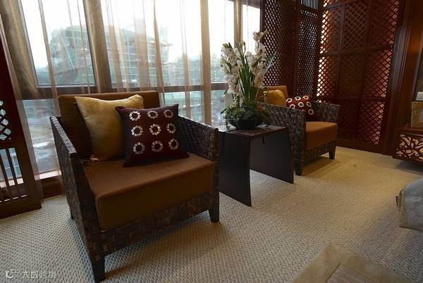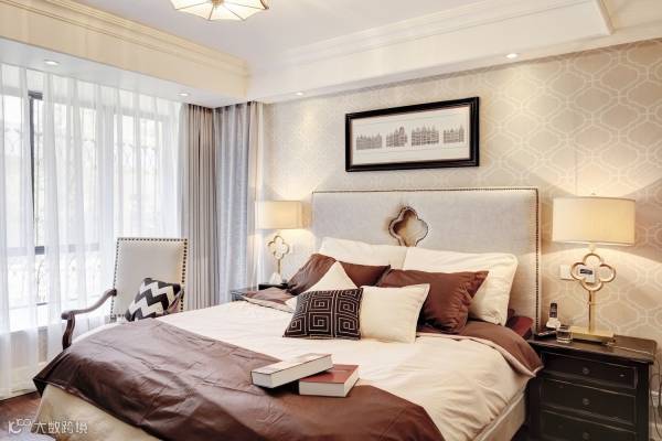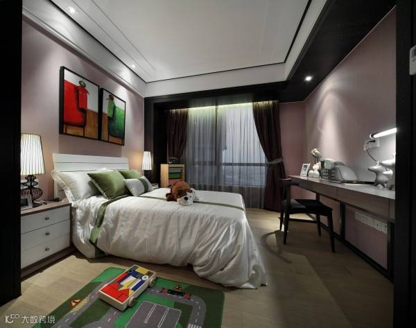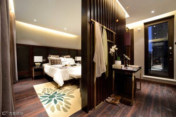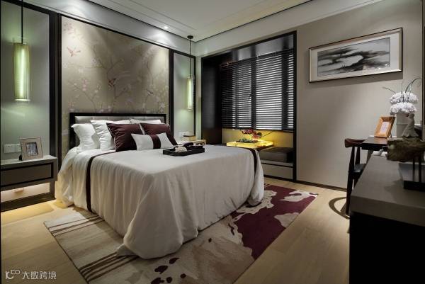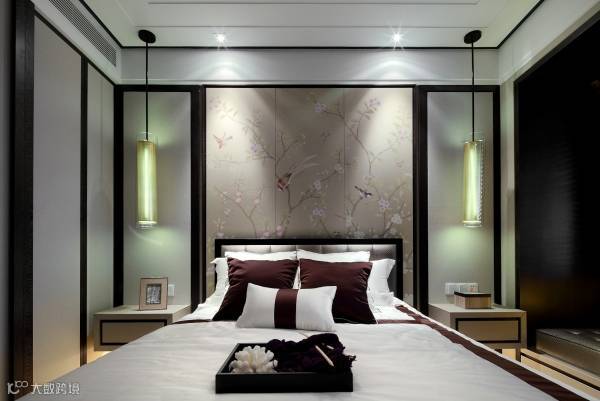 多以深色木墙板搭配同色系浅色新中式家具为主要配色方式。