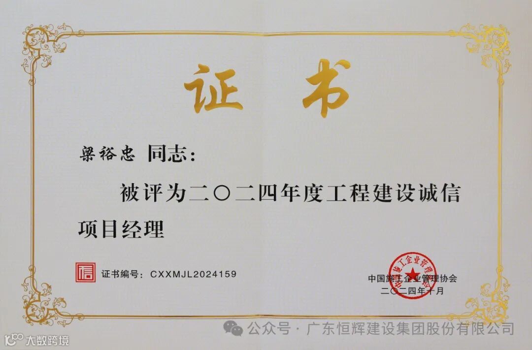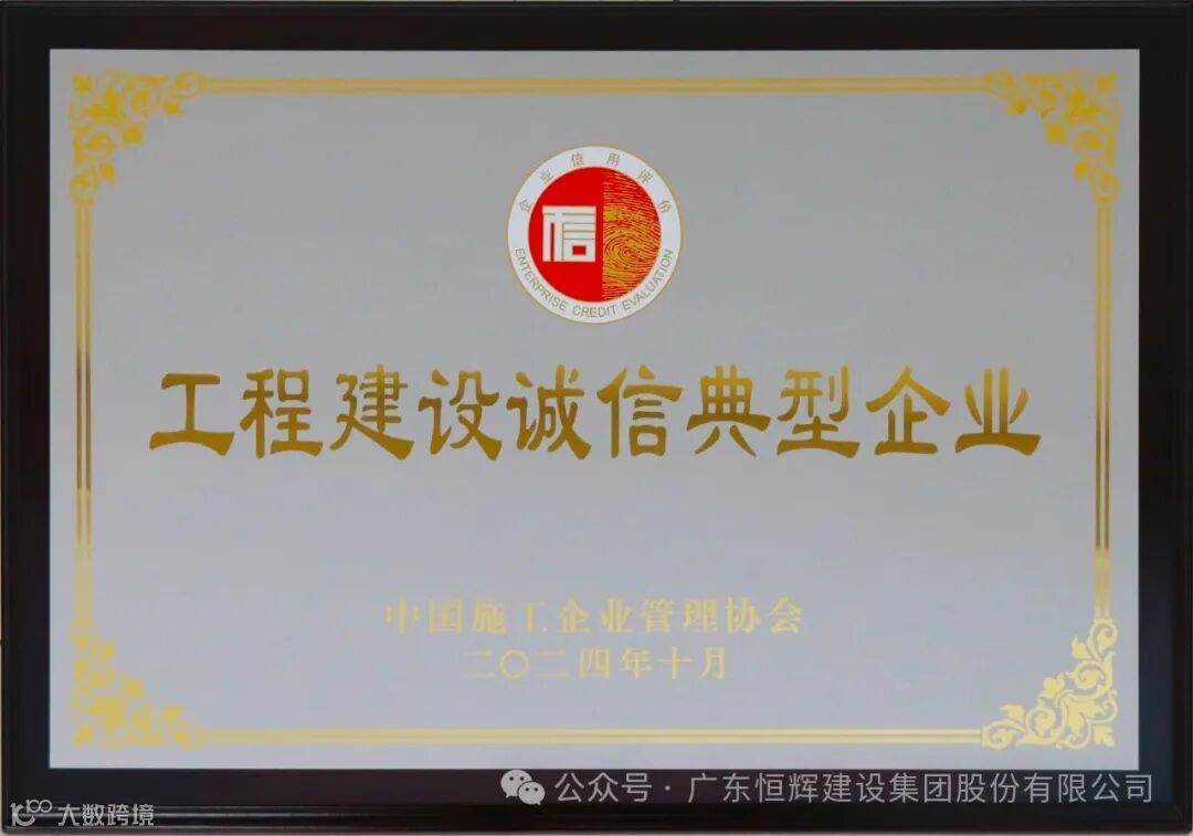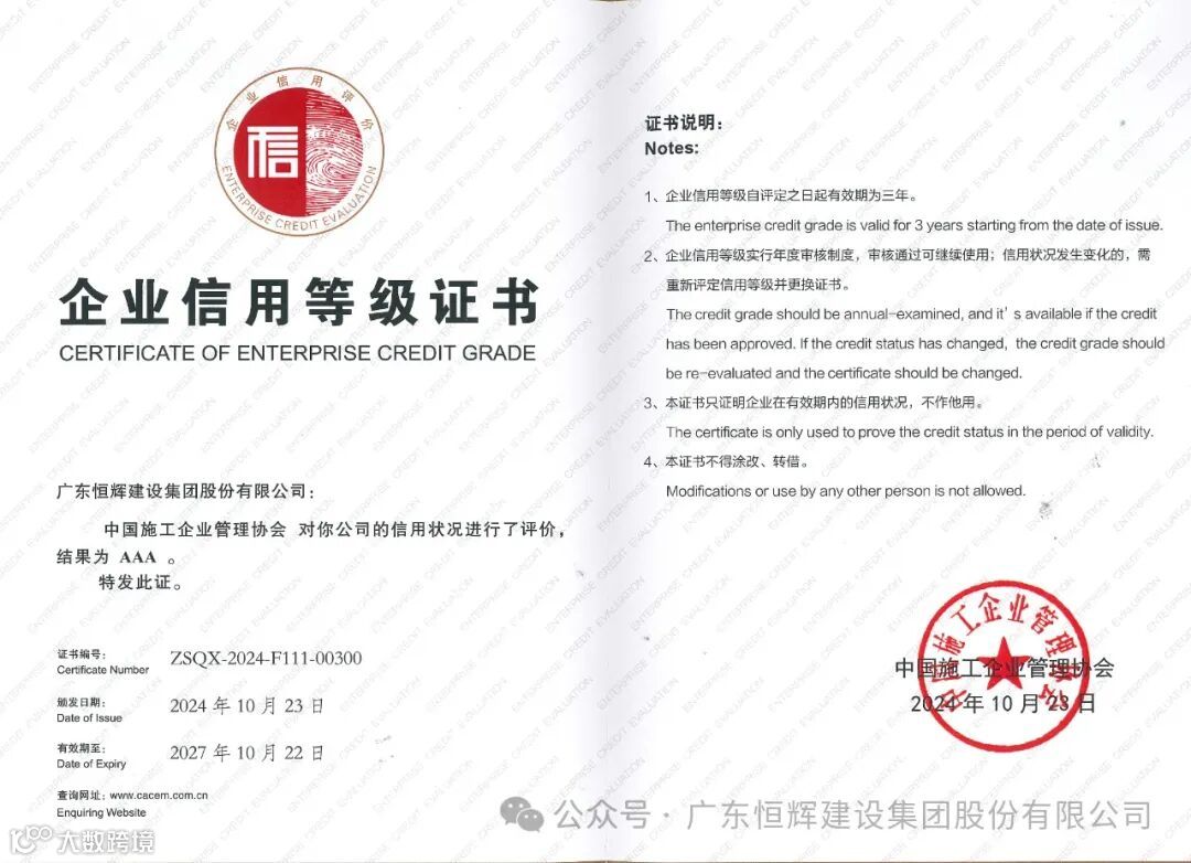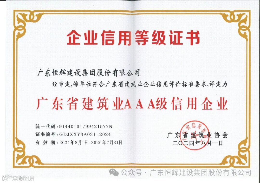 企业信用等级 AAA 证书,是企业信用的“金字招牌”,代表企业经营状况、履约能力、社会信誉等方面都达到了卓越的水平。恒辉建设集团始终将诚信作为企业发展的基石,2024年相继被中国建筑业协会、中国施工企业管理协会、中国建筑装饰协会授予最高信用等级“AAA”级评价,同时被广东省建筑业协会授予“广东省建筑业AAA级信用企业”。