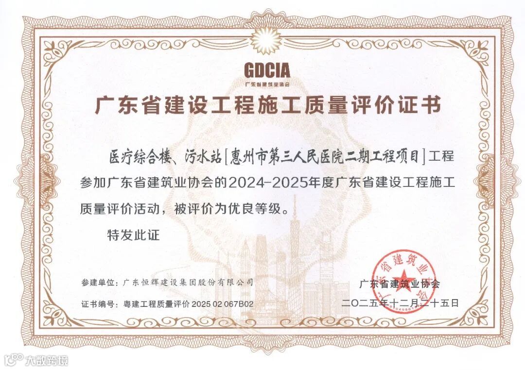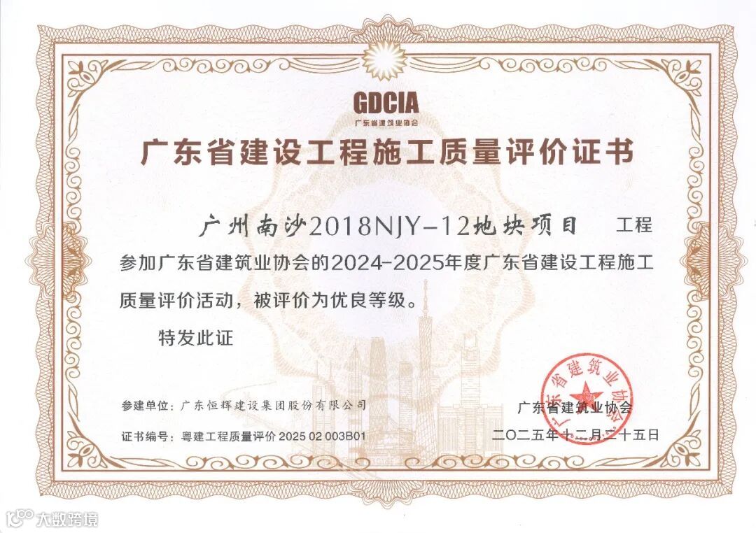 在广东省建筑业协会公布的2025年度广东省建设工程施工质量评价结果(第二批)中,由恒辉建设集团承建的广东外语外贸大学南国商学院建设项目-办公楼(自编号B-3)、广州南沙2018NJY-12地块项目、医疗综合楼污水站(惠州市第三人民医院二期工程项目)等项目成功获评“广东省建设工程施工质量评价优良等级”。