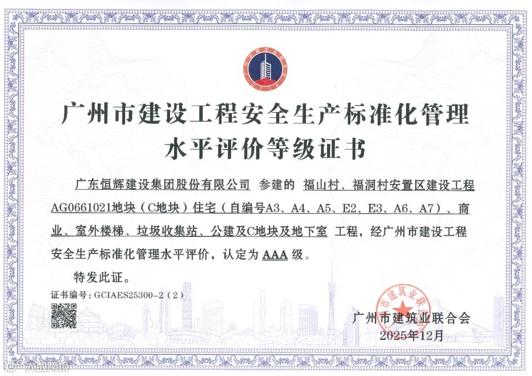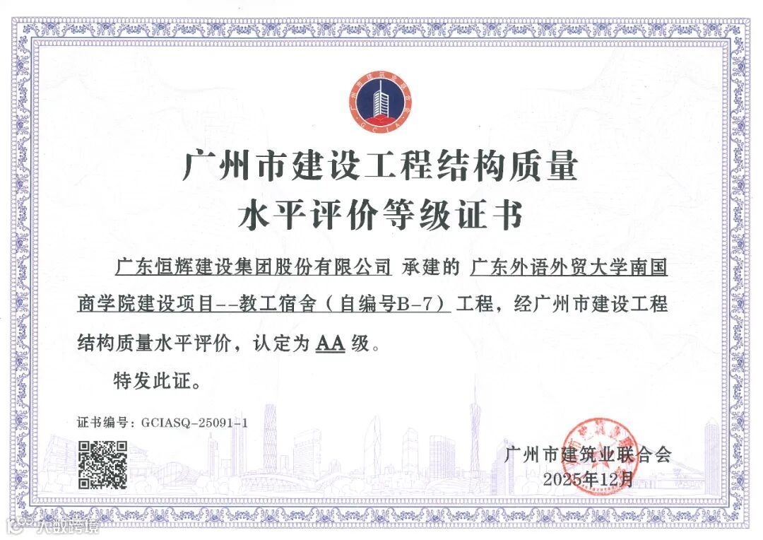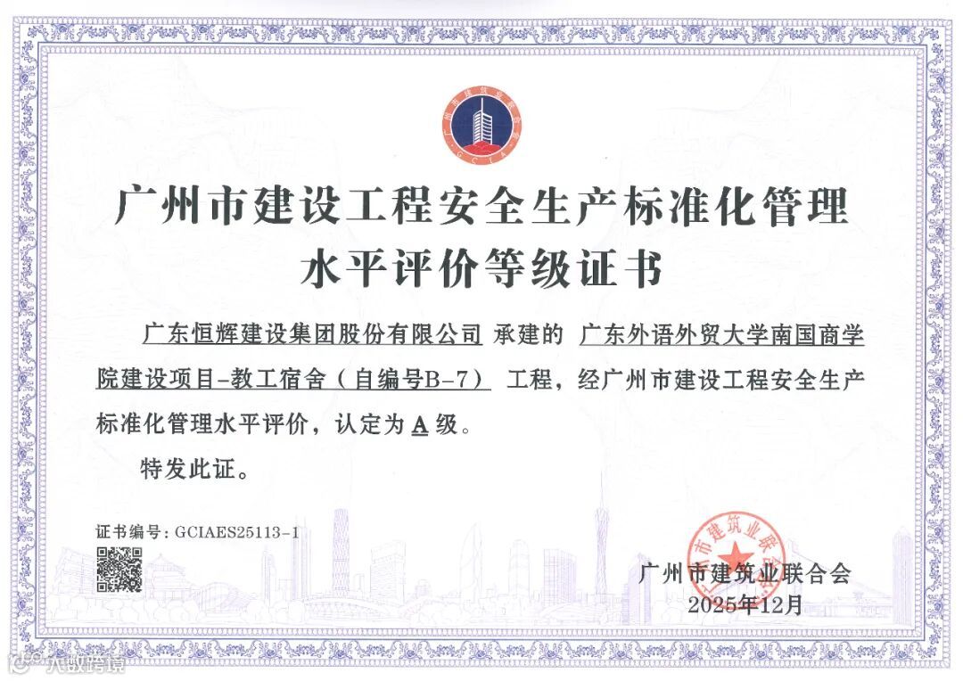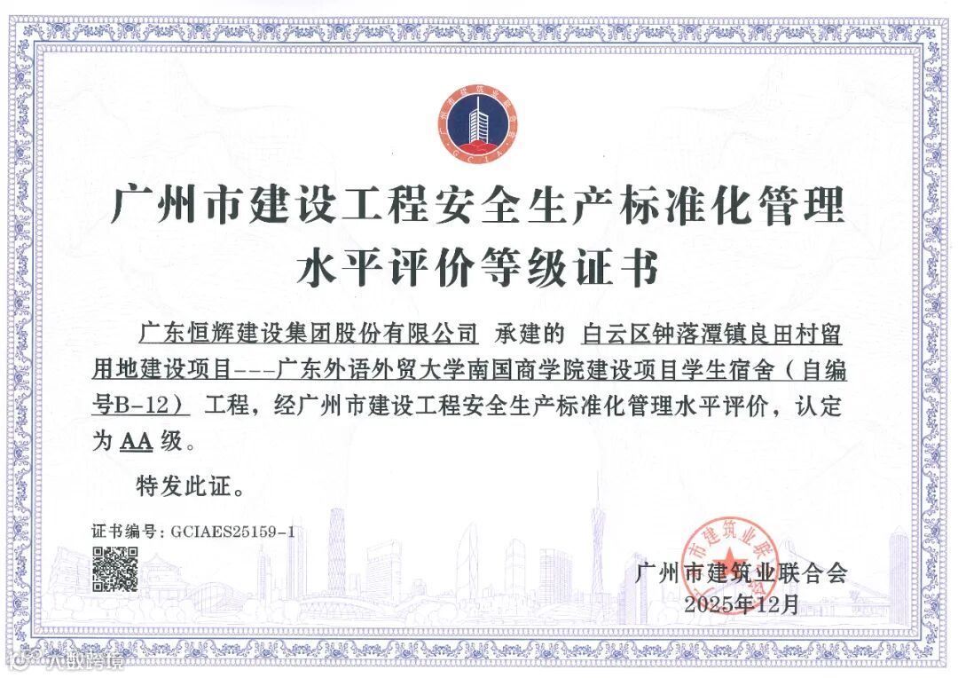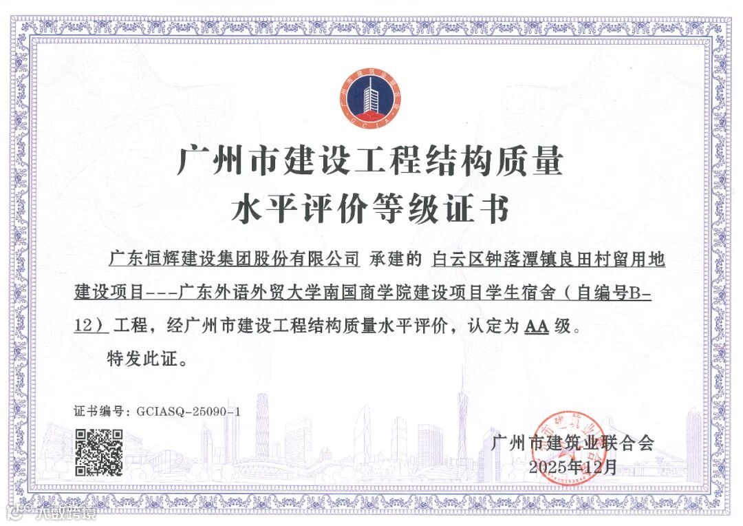 在广州市建筑业联合会公布的2025年度广州市建设工程结构质量水平评价结果及安全生产标准化管理水平评价结果中,由恒辉建设集团承建的广东外语外贸大学南国商学院建设项目-学生宿舍(自编号B-12)、广东外语外贸大学南国商学院建设项目-教工宿舍(自编号B-7)荣获“广州市建设工程结构质量水平评价AA级”;由恒辉建设集团承建的福山村福洞村安置区建设工程AG0661016地块(B地块)、广东外语外贸大学南国商学院建设项目学生宿舍(自编号B-12)、广州达顺置业有限公司建设荔湖G2021012号地块住宅项目等6个项目分别荣获广州市建设工程安全生产标准化管理水平评价AAA级、AA级、A级等荣誉。