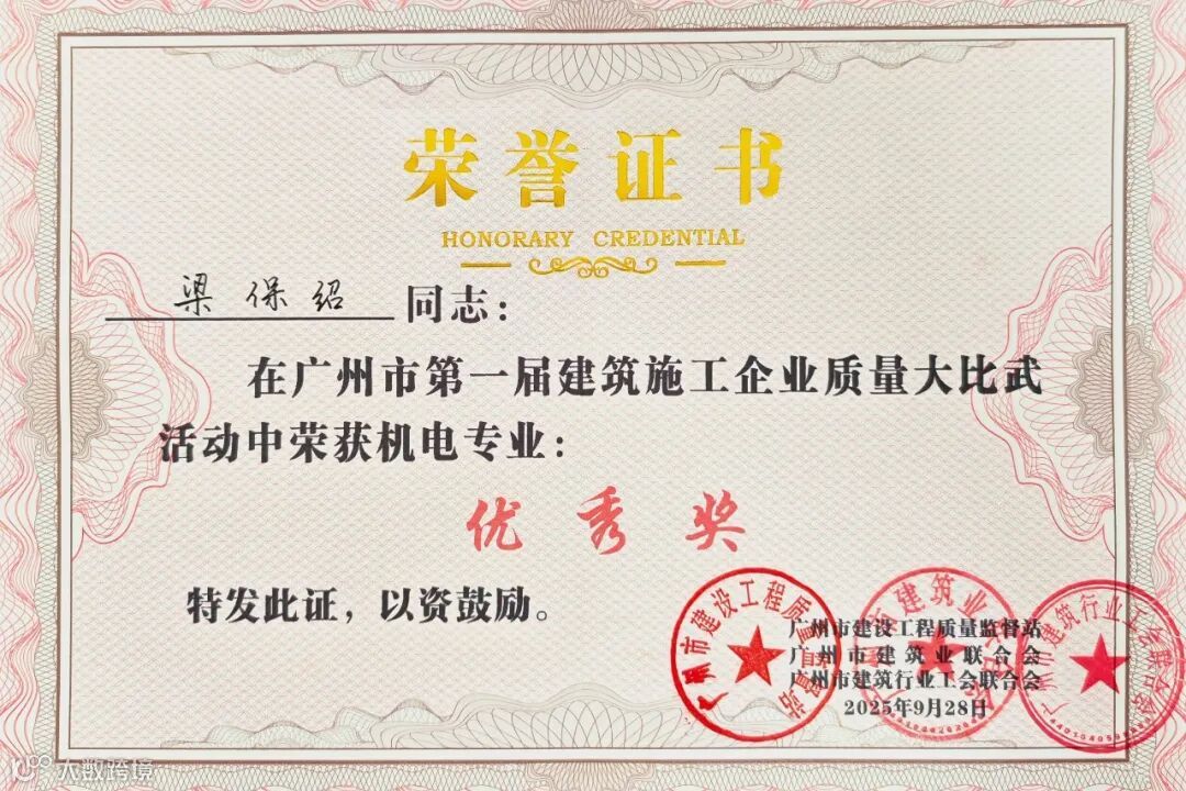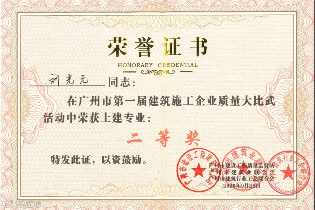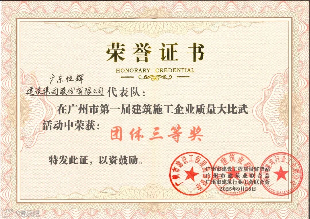 匠心铸就精品,质量赢得未来。近日,在广州市第一届建筑施工企业质量大比武活动中,恒辉建设质量管理团队凭借卓越的整体实力与精湛的专业技艺,成功斩获团体三等奖。与此同时,在个人赛项的激烈角逐中,团队代表刘光元勇夺土建专业二等奖,梁保绍荣获机电专业优胜奖,他们用实力为公司荣誉再添璀璨星光。
