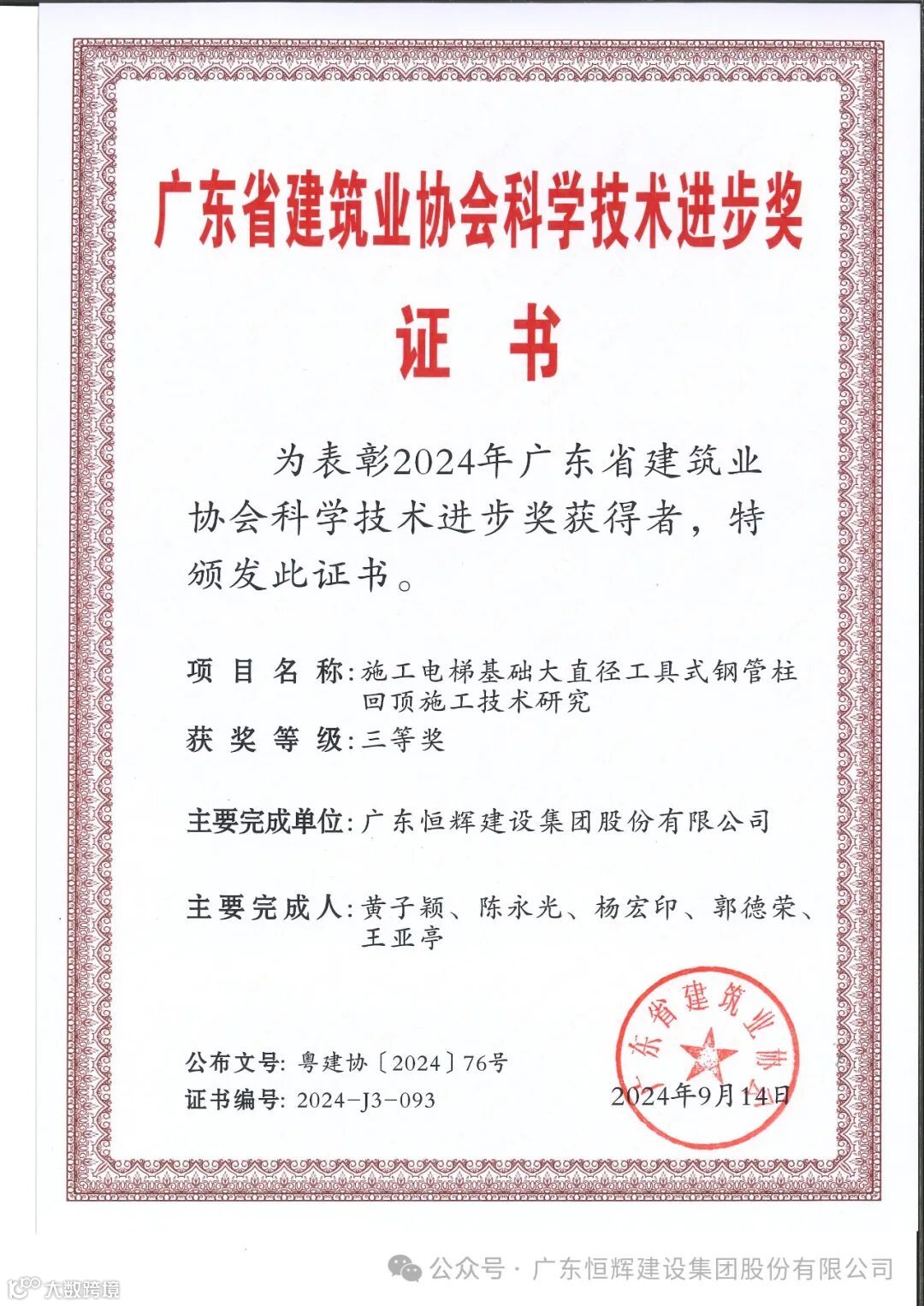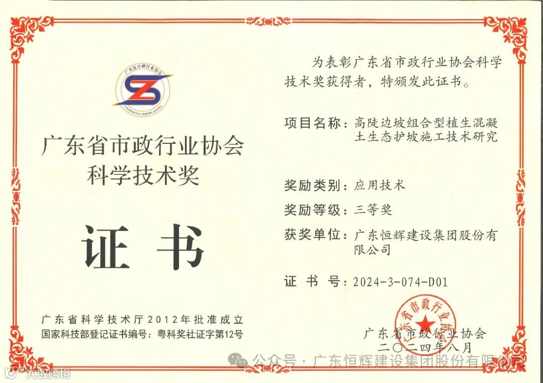 近日,广东省建筑业协会、广东省市政行业协会先后发布了本协会关于2024年科学技术奖获奖名单的通知。恒辉建设集团凭借出色的创新能力,申报的“高陡边坡组合型植生混凝土生态护坡施工技术研究”“明挖现浇电力隧道半自动钢内模台车施工技术研究”2项成果获得2024年广东省市政行业协会科学技术奖三等奖。申报的“施工电梯基础大直径工具式钢管柱回顶施工技术研究”获得2024年广东省建筑业协会科学技术进步奖三等奖。