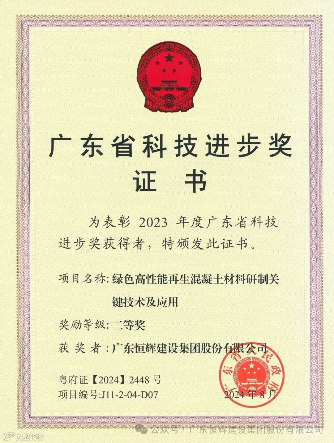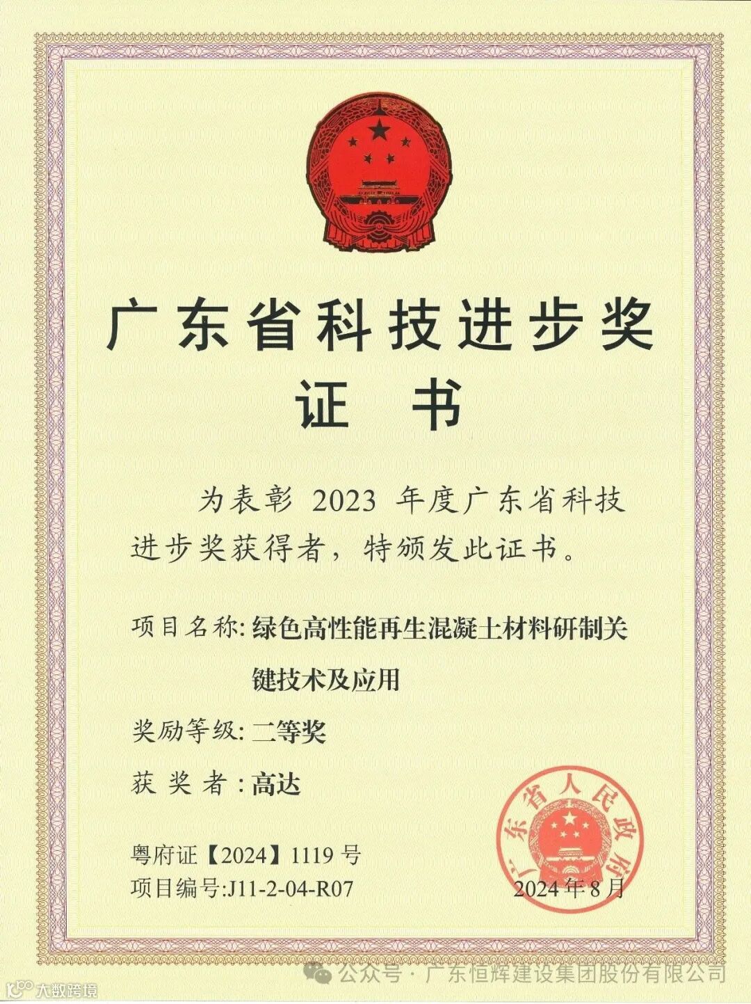 由恒辉建设集团参与研发的“绿色高性能再生混凝土材料研制关键技术及应用项目”获得2023年度广东省科技进步奖二等奖。广东省科学技术奖是由广东省人民政府设立,是广东省科技领域的最高奖项,代表广东省科技发展的最高水平。