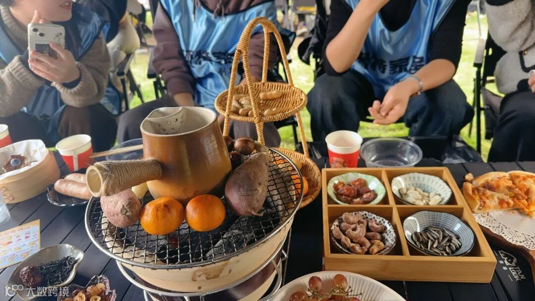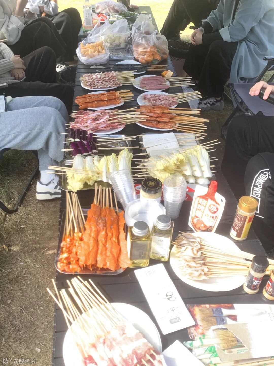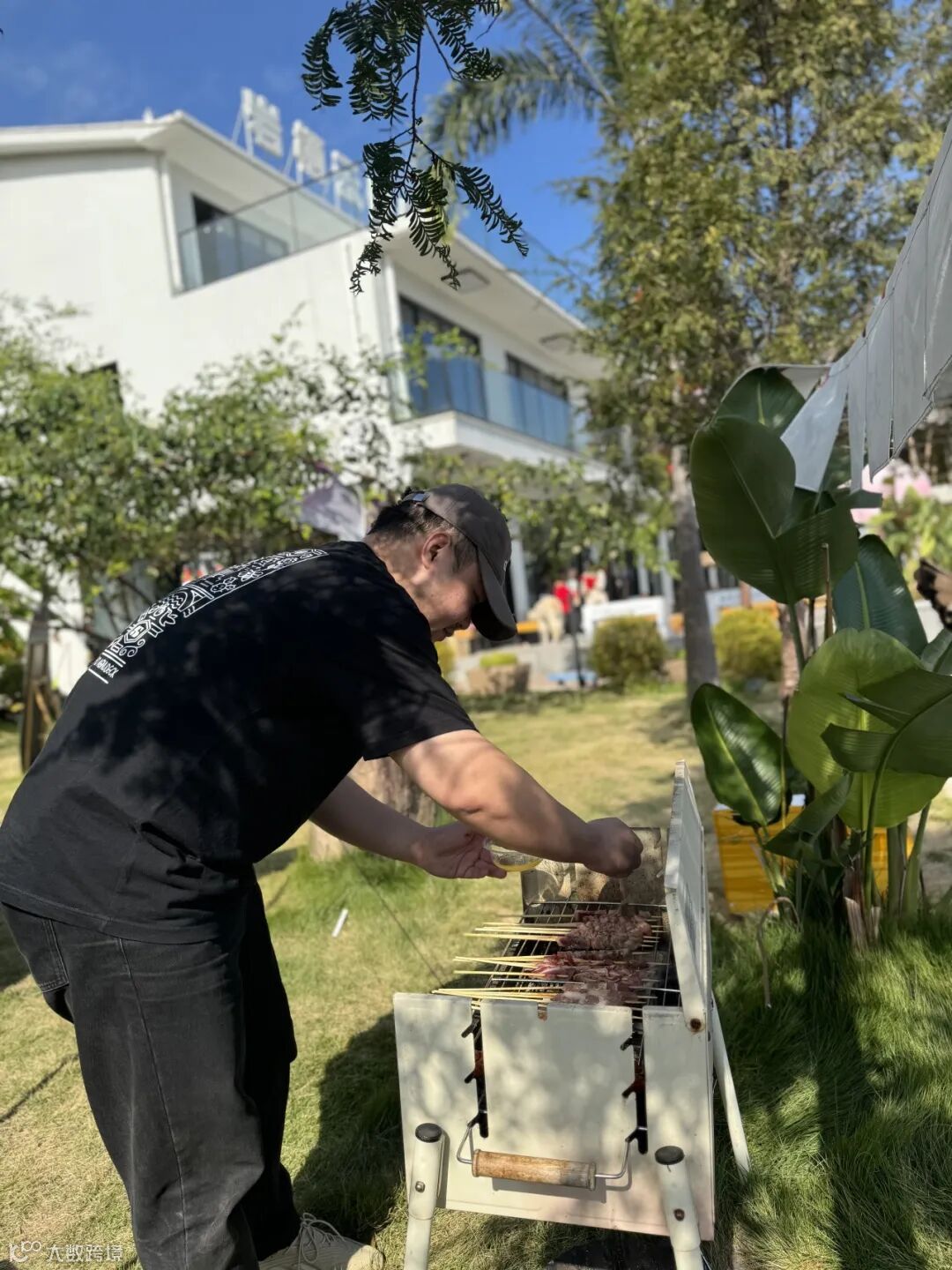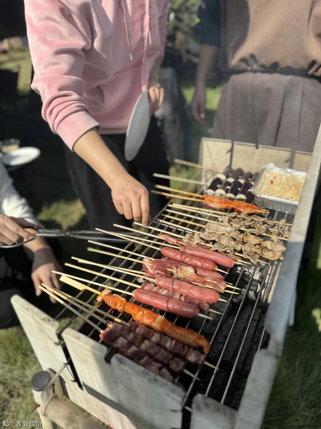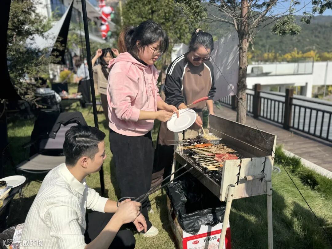 接下来是自由活动时间,场地里有很多好看的布景,大家纷纷拍照留念,也有一些人选择休息放松。随着时间的推移,到了中午时分,大家开始准备烧烤。各组的厨艺纷纷展现出来,有人负责串肉,有人负责烤肉,还有人负责准备各种调料和配菜。