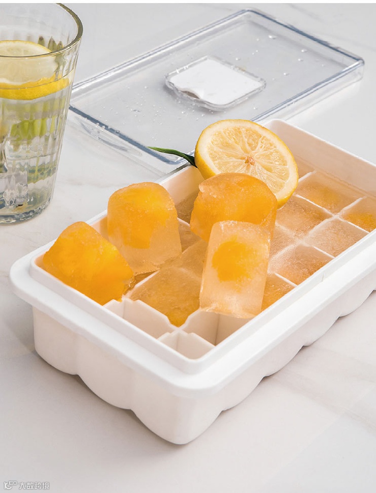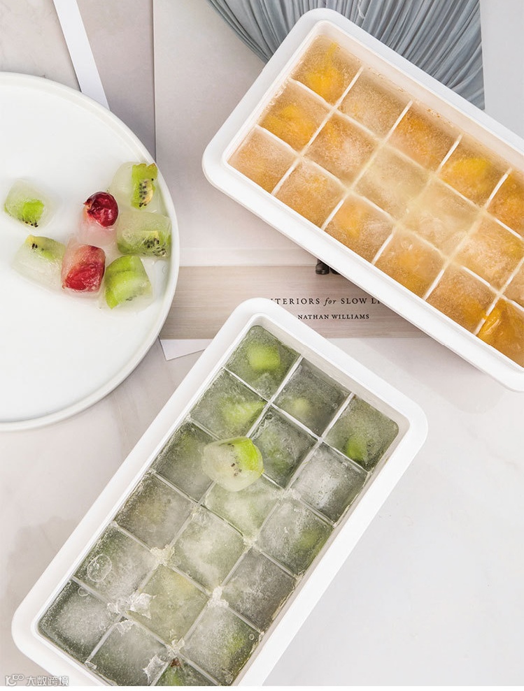 这款冰格带盖设计,防串味,孔注水,盖子两边把手设计,轻松揭开。并且底部是硅胶材质,取出后即刻取冰,只需轻松一顶!易拿易放,不占空间。而且还易清晰,用水轻轻一冲洗就可。