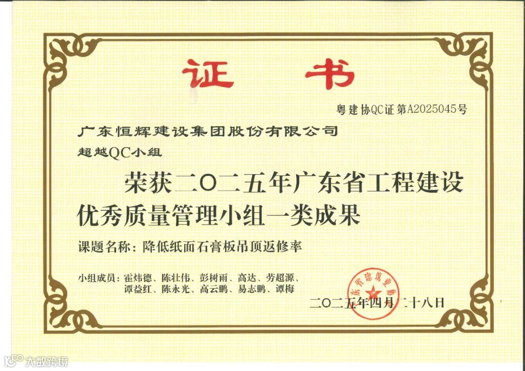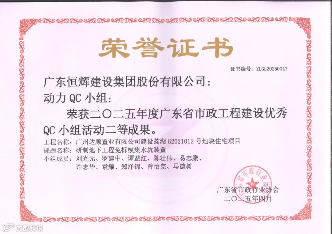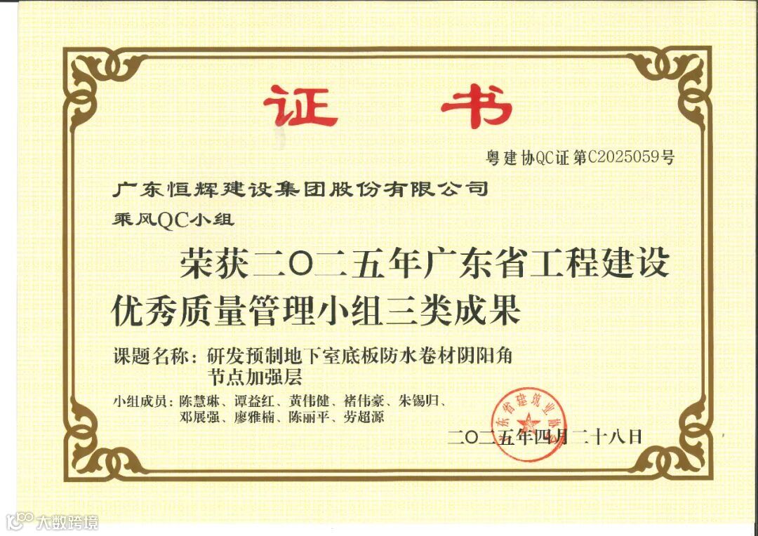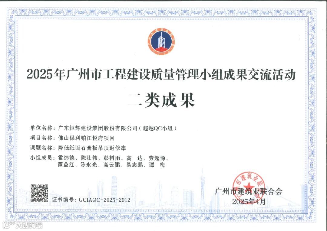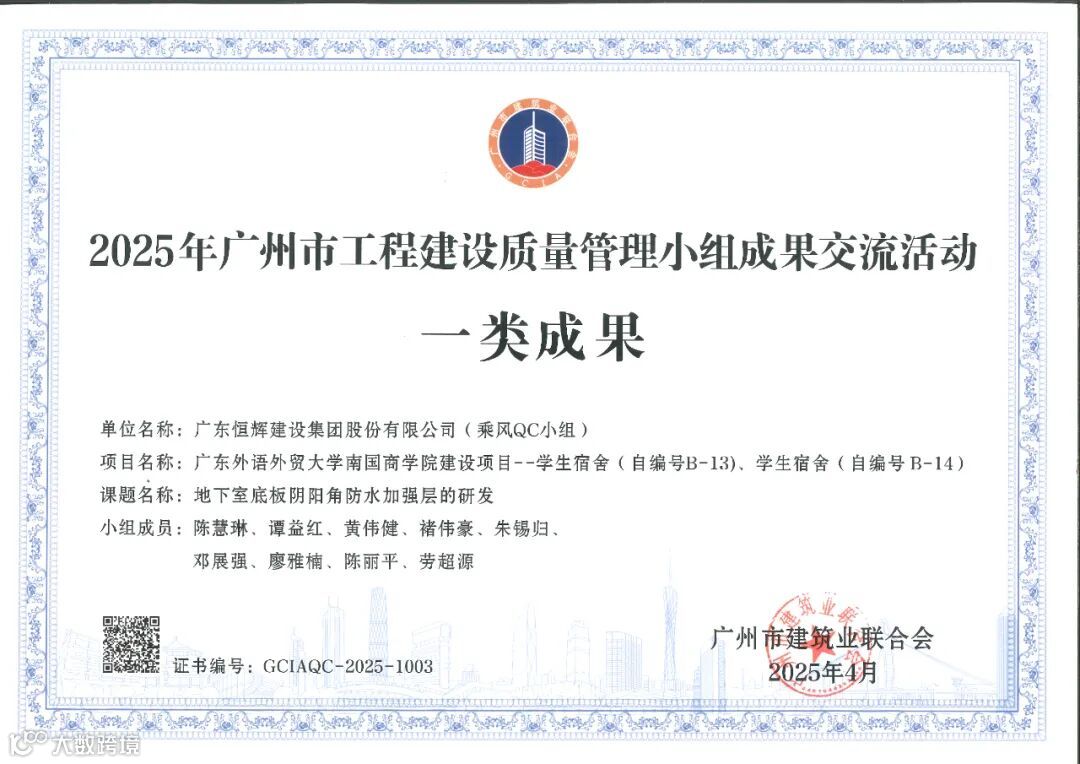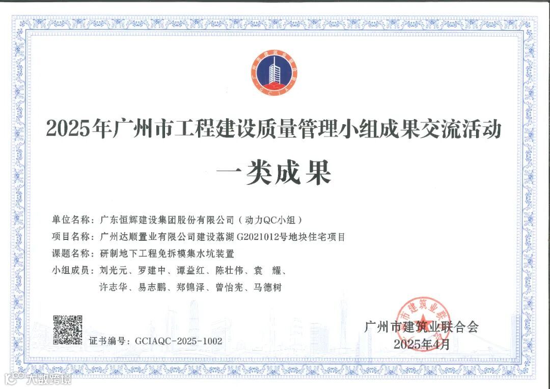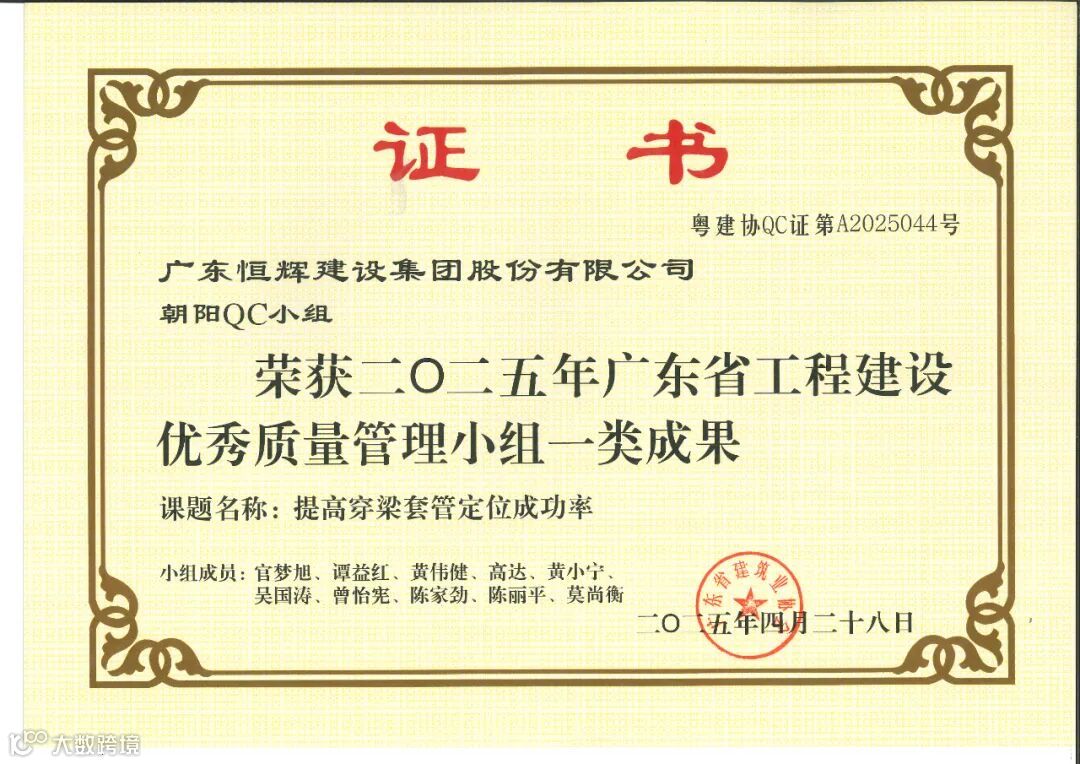 在广东省建筑业协会、广东省市政行业协会分别发布的2025年工程建设优秀质量管理小组活动竞赛评比结果中,恒辉建设技术管理团队申报的8项QC课题均获得了省级表彰,其中获得了一类成果奖5项、二类成果奖2项、三类成果奖1项。
