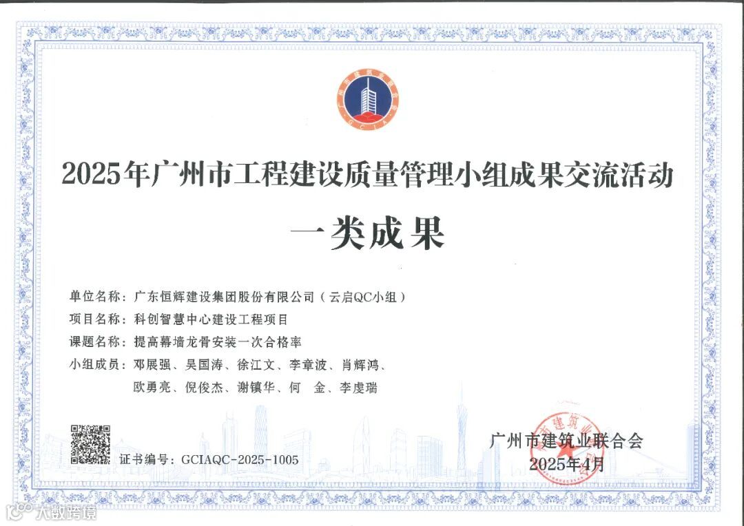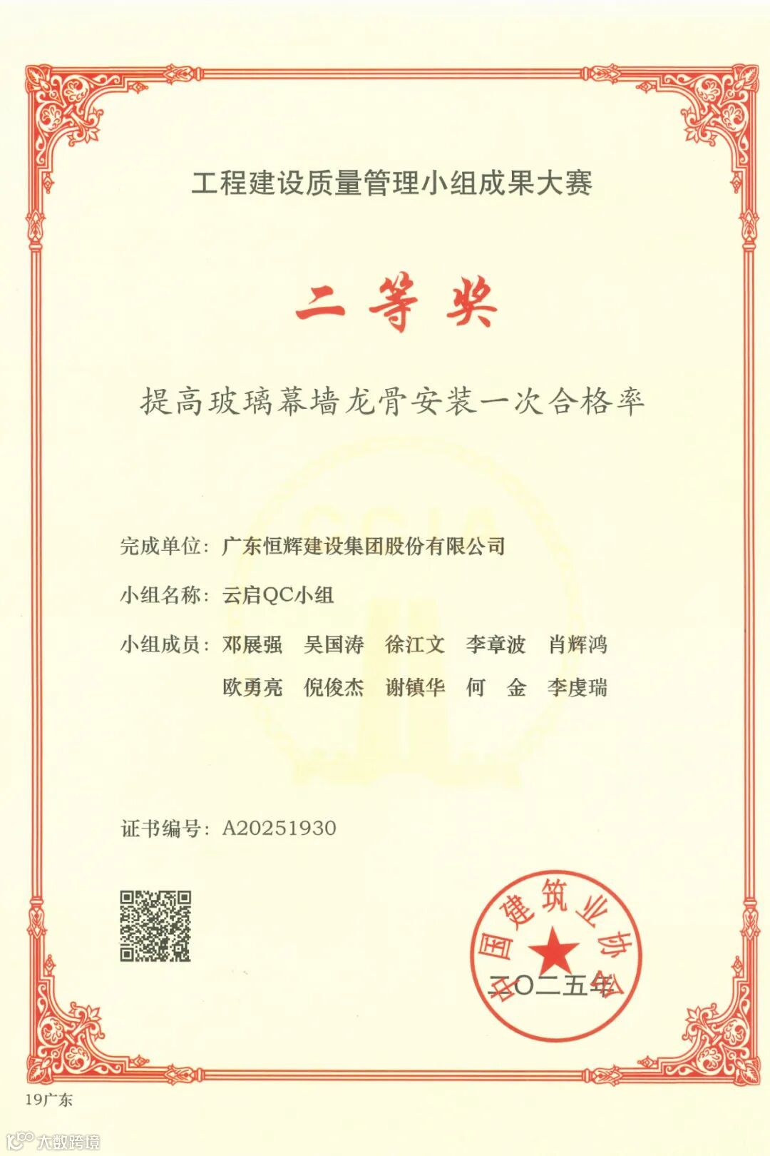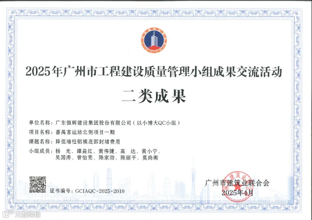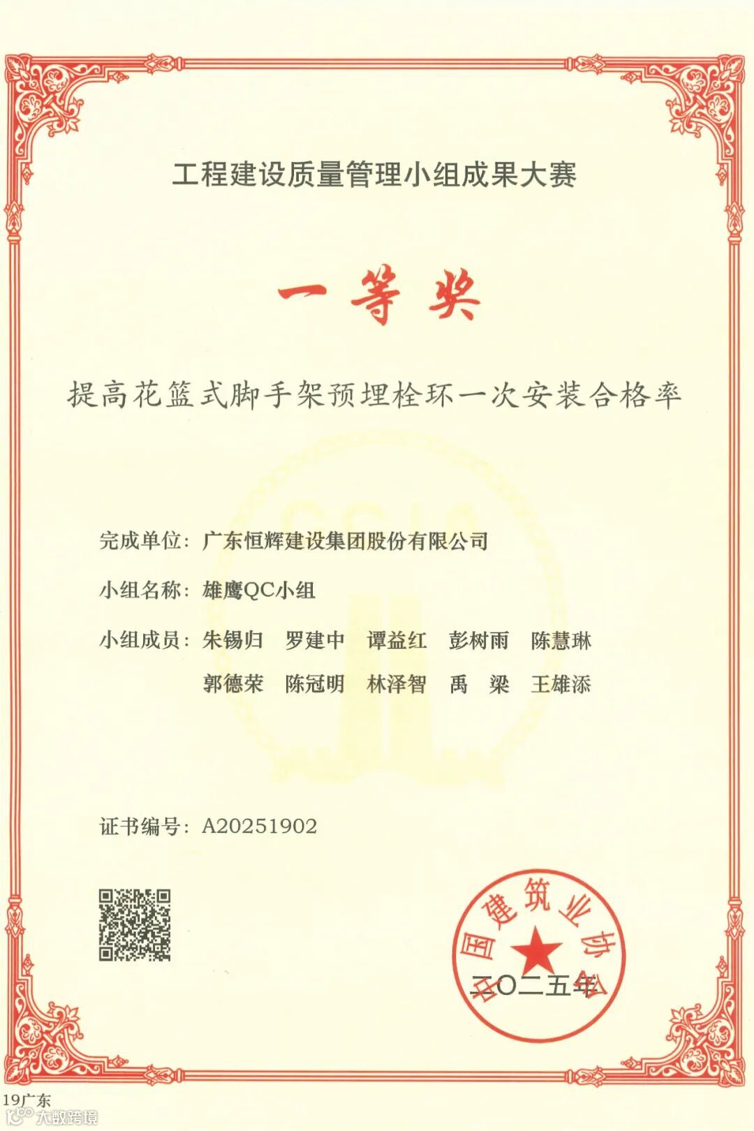 在中国建筑业协会、中国施工企业管理协会分别发布的2025年工程建设质量管理小组活动评比结果中,恒辉建设技术管理团队凭借卓越的专业技术能力,申报的“提高花篮式脚手架预埋栓环一次安装合格率”、“提高玻璃幕墙龙骨安装一次合格率”分别获得工程建设质量管理小组成果大赛一等奖、二等奖,“研制墙柱铝模底部充气封堵装置”获得2025年工程建设质量管理小组活动竞赛二等成果。