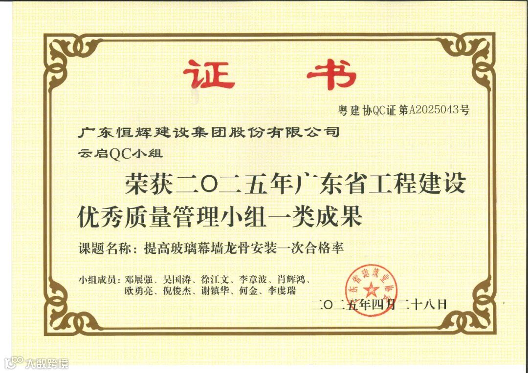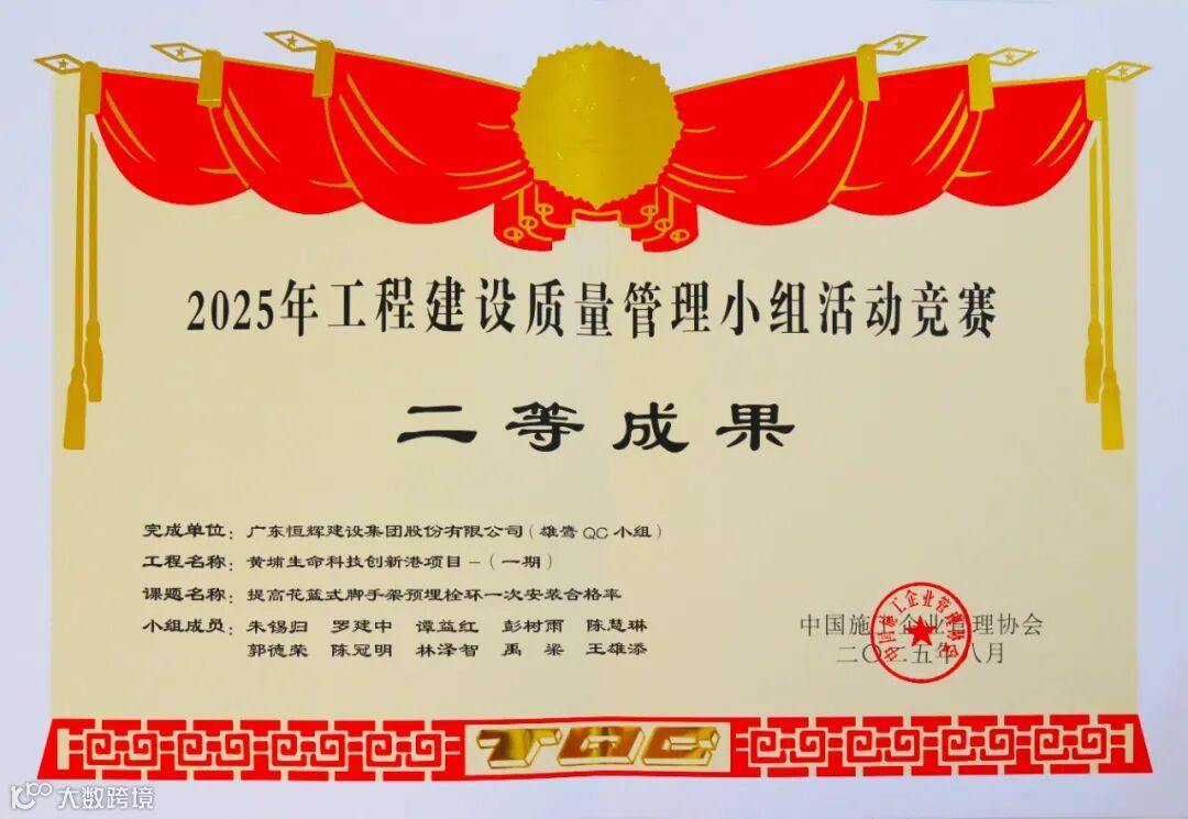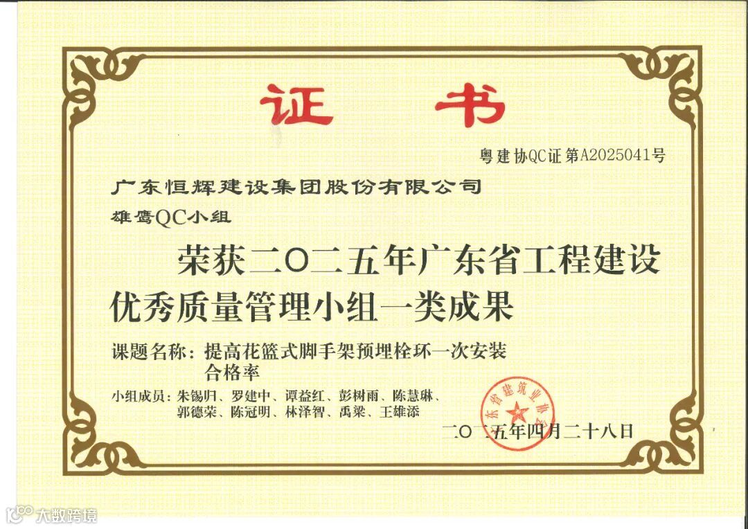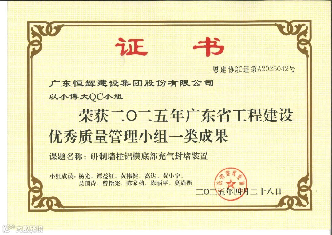 在中国建筑业协会、中国施工企业管理协会分别发布的2025年工程建设质量管理小组活动评比结果中,恒辉建设技术管理团队凭借卓越的专业技术能力,申报的“提高花篮式脚手架预埋栓环一次安装合格率”、“提高玻璃幕墙龙骨安装一次合格率”分别获得工程建设质量管理小组成果大赛一等奖、二等奖,“研制墙柱铝模底部充气封堵装置”获得2025年工程建设质量管理小组活动竞赛二等成果。