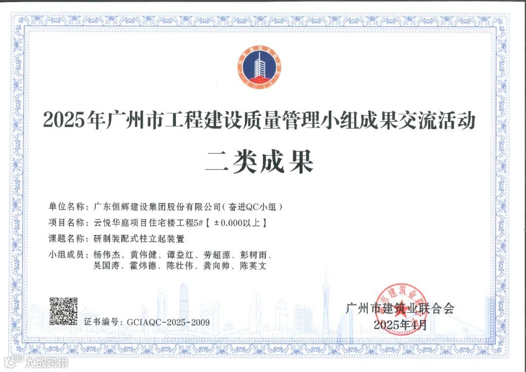 在广州市建筑业联合会发布的广州建设行业质量管理小组活动成果交流活动评比结果中,恒辉建设技术管理团队申报的9项QC课题均获得了市级表彰,其中获得了一类成果奖4项、二类成果奖4项、三类成果奖1项。
