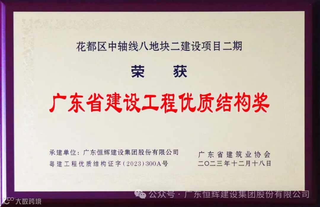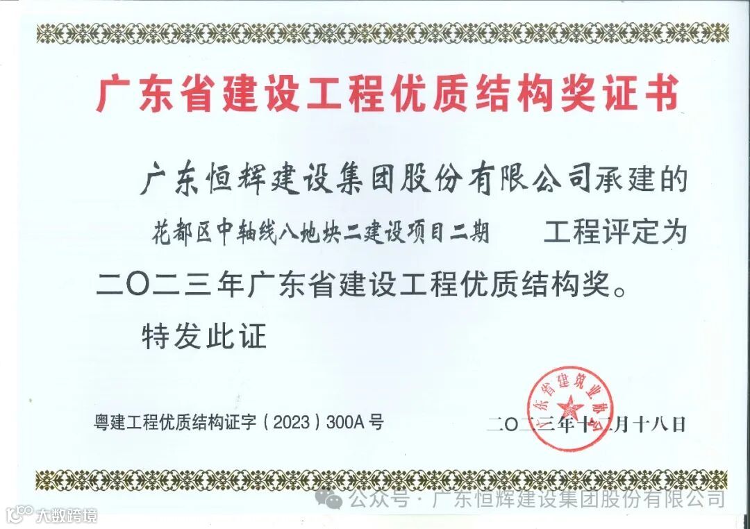 恒辉建设集团始终坚持以过程精品打造精品工程,严格要求自身施工质量。由集团承建的花都区中轴线八地块二建设项目二期被评为“2023年度广东省建设工程优质结构奖”荣誉称号。
