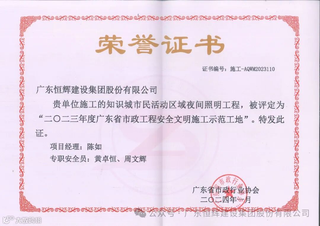 同时,广东省市政行业协会公布了《广东省市政工程安全文明施工示范工地获奖名单》。由我司承建的惠环街道办道路完善工程、知识城市民活动区域夜间照明工程均被评为“2023年度广东省市政工程安全文明施工示范工地”。