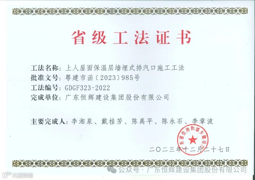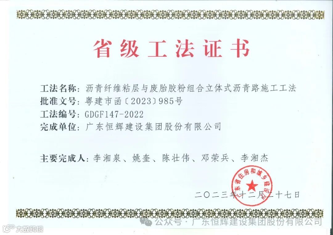 由恒辉建设集团完成的“沥青纤维粘层与废胎胶粉组合立体式沥青路施工工法”“上人屋面保温层墙埋式排汽口施工工法”获2023年度广东省工程建设省级工法,两项工法关键技术总体达到了国内领先水平。