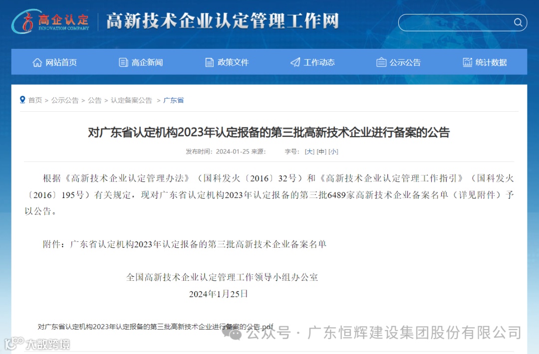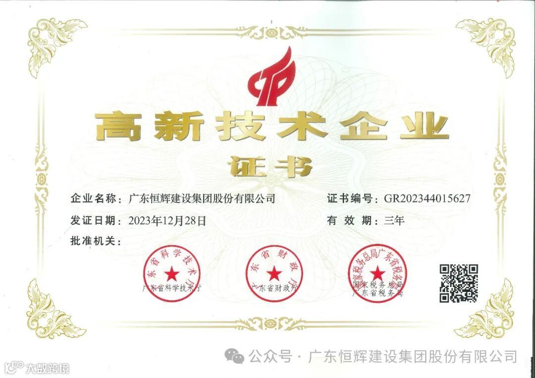 主要从企业核心自主知识产权、科技成果转化能力、研究开发组织管理水平、企业经营成长性等方面进行考核。在国家级的资质认证中,高新技术企业是科技型企业最具含金量荣誉之一,也是对企业科技综合实力的权威肯定。这一资质展示了恒辉建设集团科研技术的硬核实力。