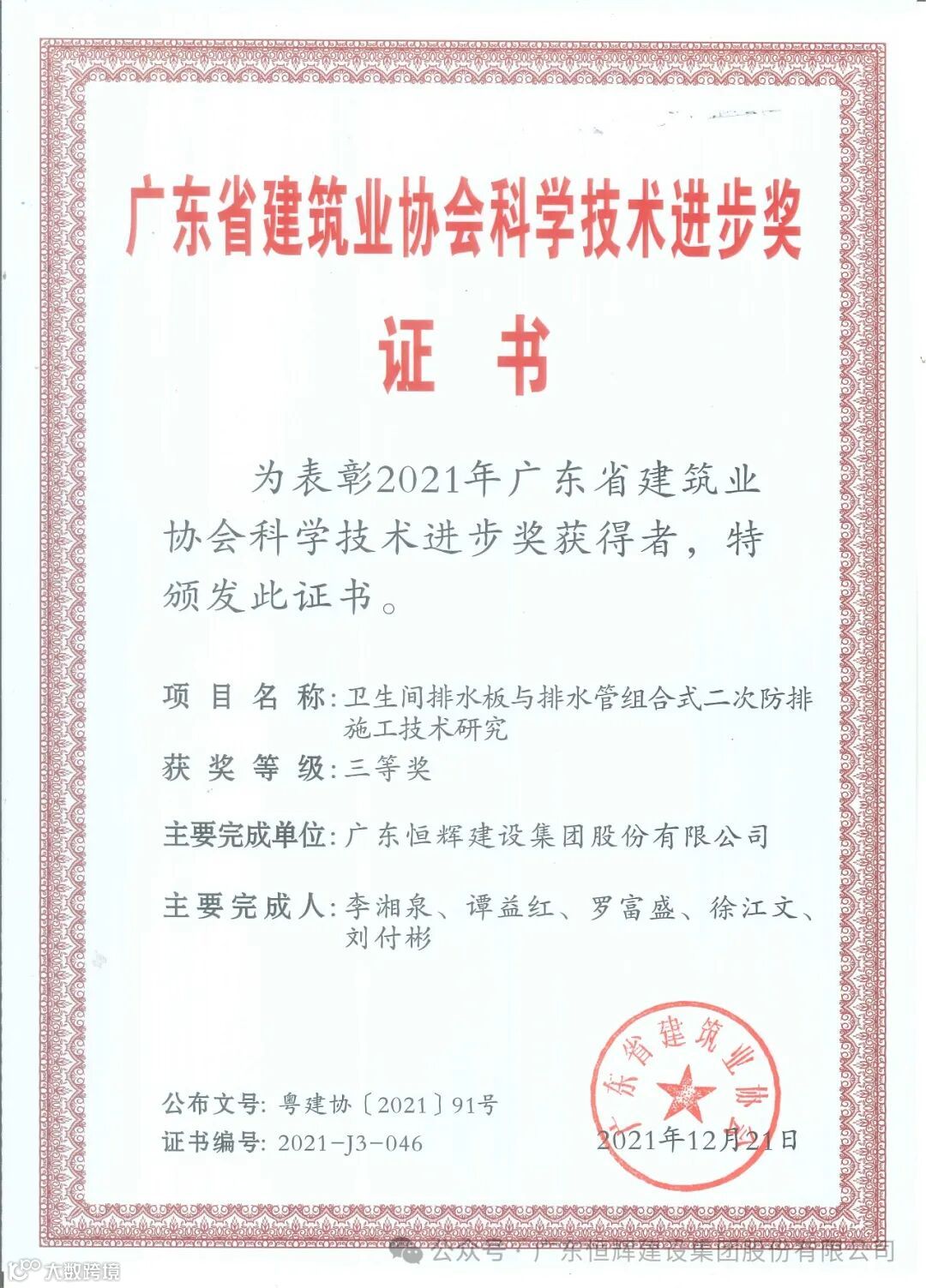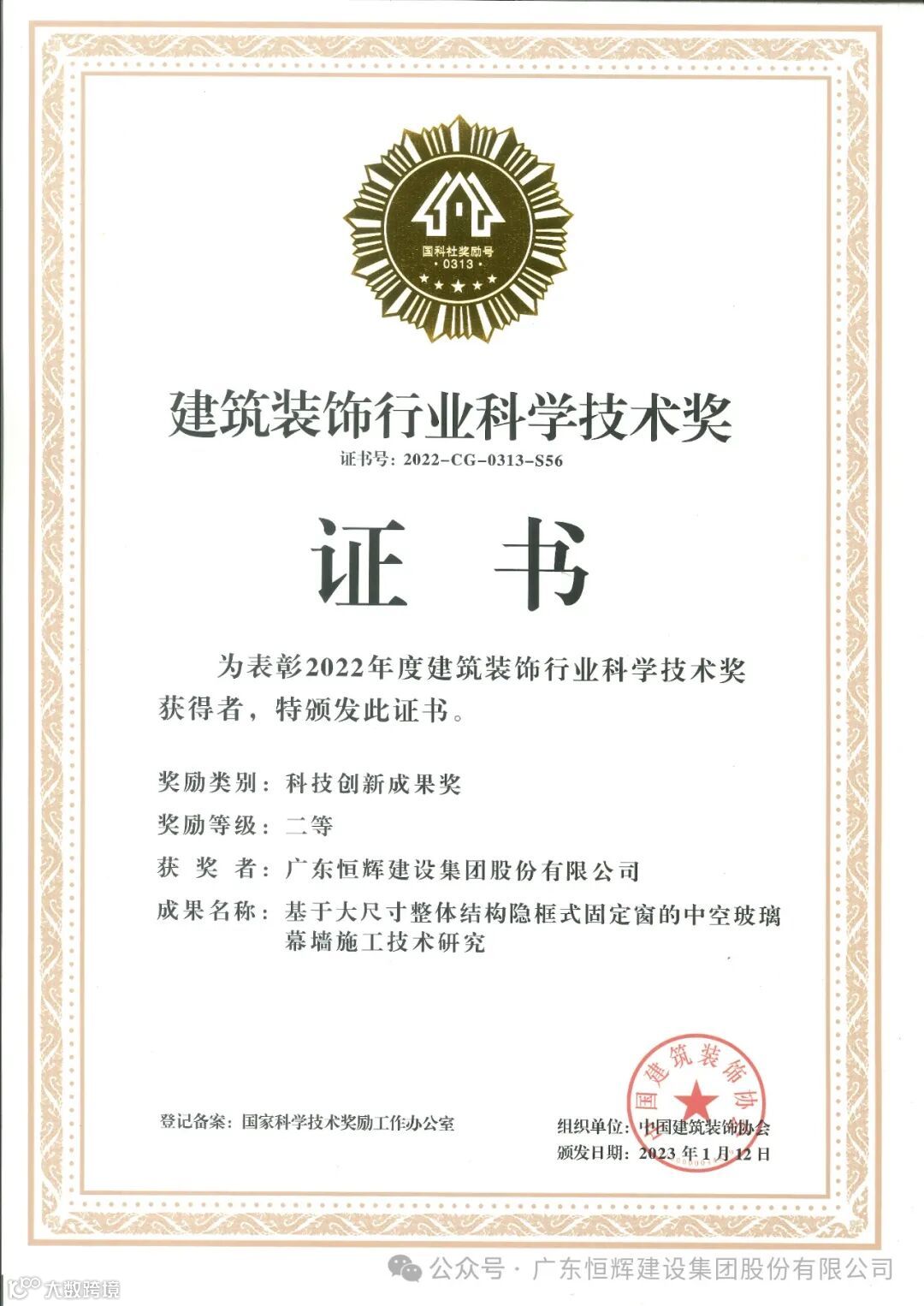 2020年-2022年,恒辉建设集团通过自主创新、产学研合作等形式,组建了专业化的科技研发团队,开展了近百个项目课题的研发,完善了我司的知识产权架构。同时,公司聚焦建筑行业前沿领域和成果转化,强化科技创新体系,建立了完善的技术创新组织管理制度,并于2021年获得“省级企业技术中心”称号。通过提供拥有自主知识产权的施工服务,增加了集团在施工服务的市场附加值,实现了企业技术的更新换代,为公司发展注入了源源不断的动力。