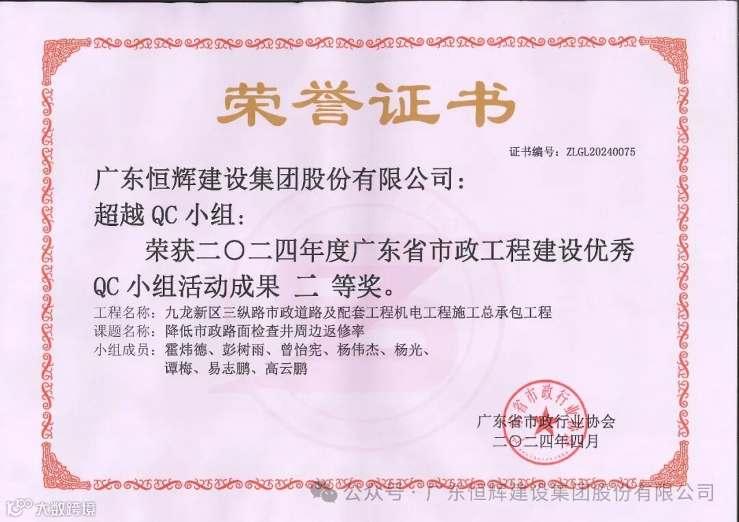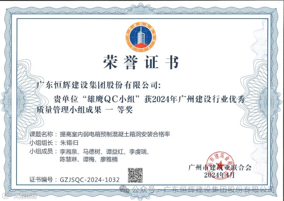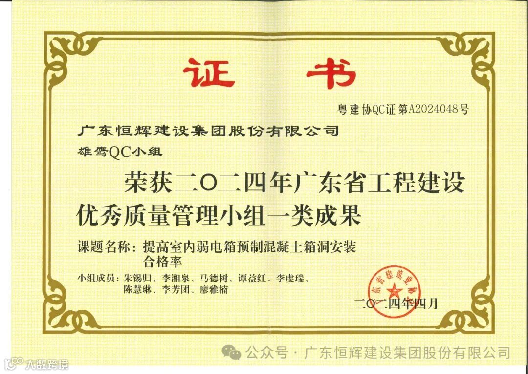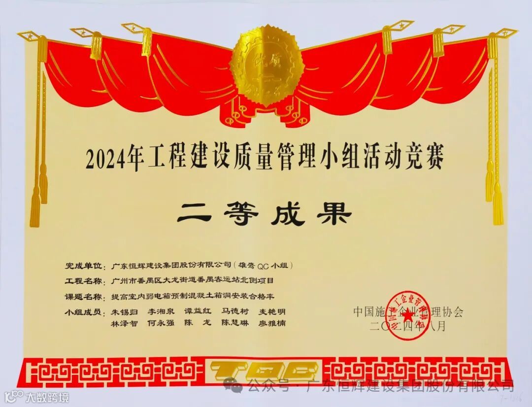 中国施工企业管理协会发布2024年工程建设质量管理小组活动优秀成果。恒辉建设集团凭借出色的创新能力,申报的“提高室内弱电箱预制混凝土箱洞安装合格率”“提高城市沥青路面与平石连接处的平顺度”获得二等成果奖。