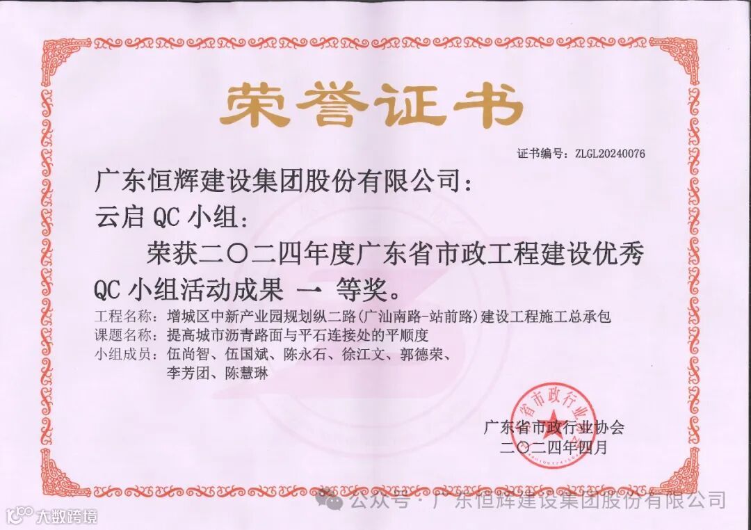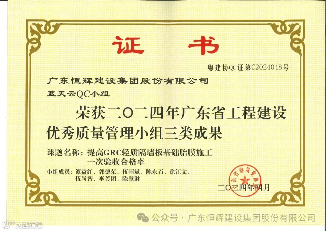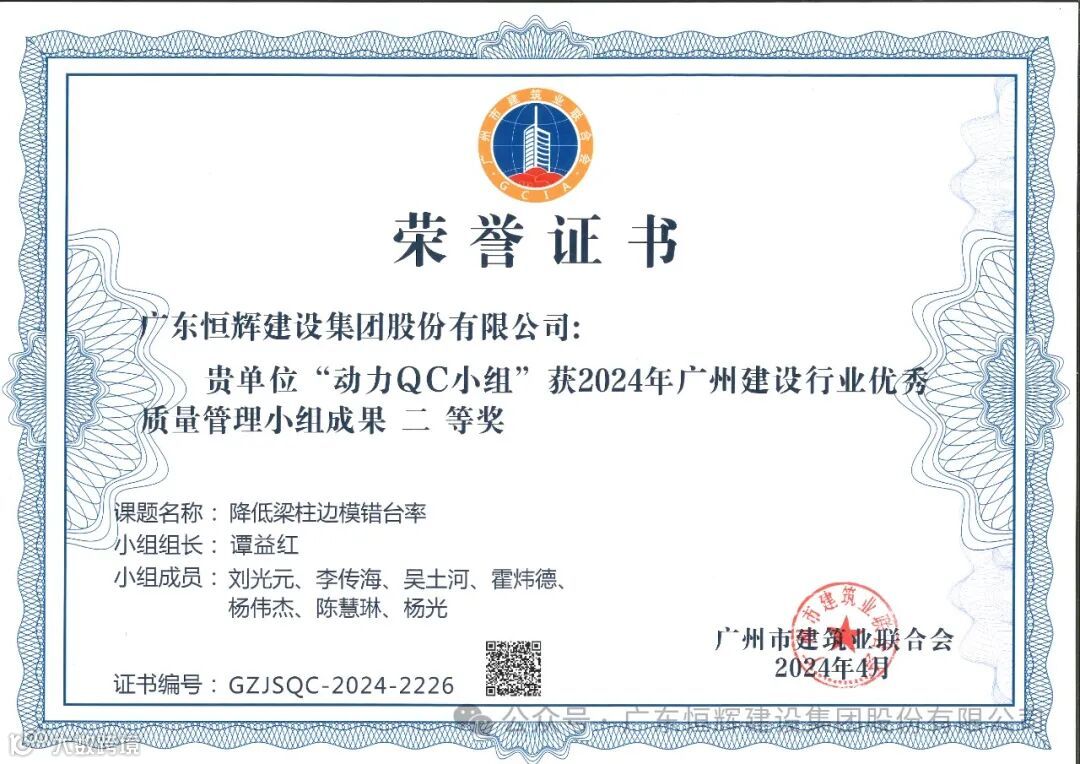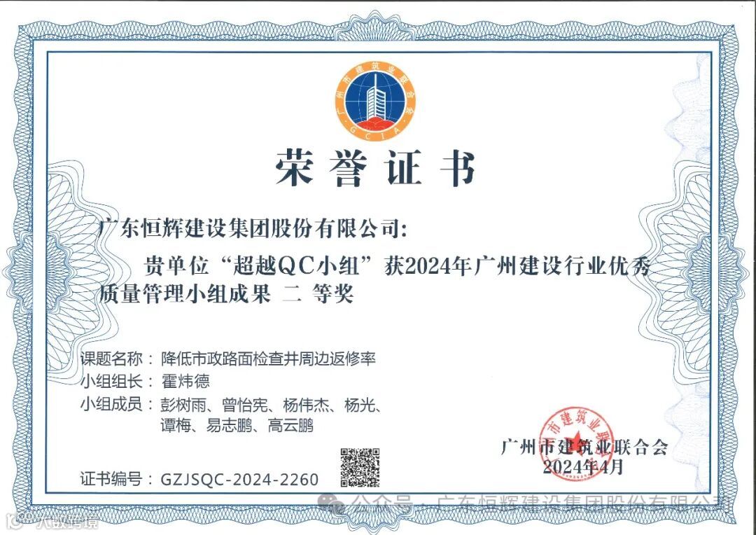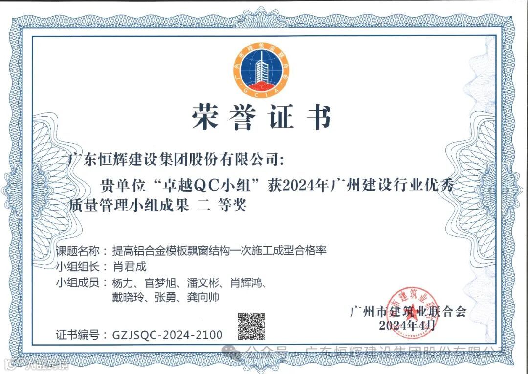 广州市建筑业联合会开展了广州建设行业质量管理小组活动成果交流活动。恒辉建设集团参与申报多项QC课题,其中“提高室内弱电箱预制混凝土箱洞安装合格率”“提高城市沥青路面与平石连接处的平顺度”等2项成果获得一类成果奖;“提高铝合金模板飘窗结构一次施工成型合格率”“降低梁柱边模错台率”“提高铝模墙柱线盒预埋一次验收合格率”“提高构造柱混凝土合格率”“降低市政路面检查井周边返修率”等5项成果获得二类成果奖。