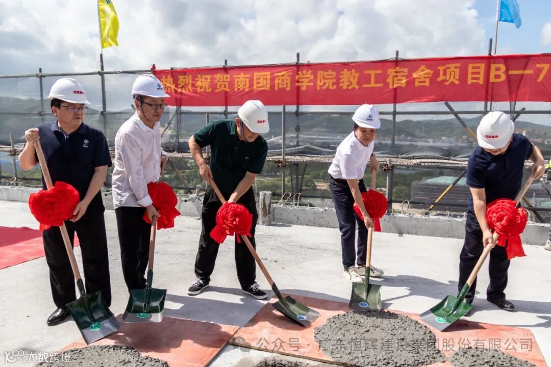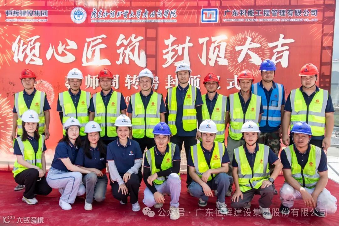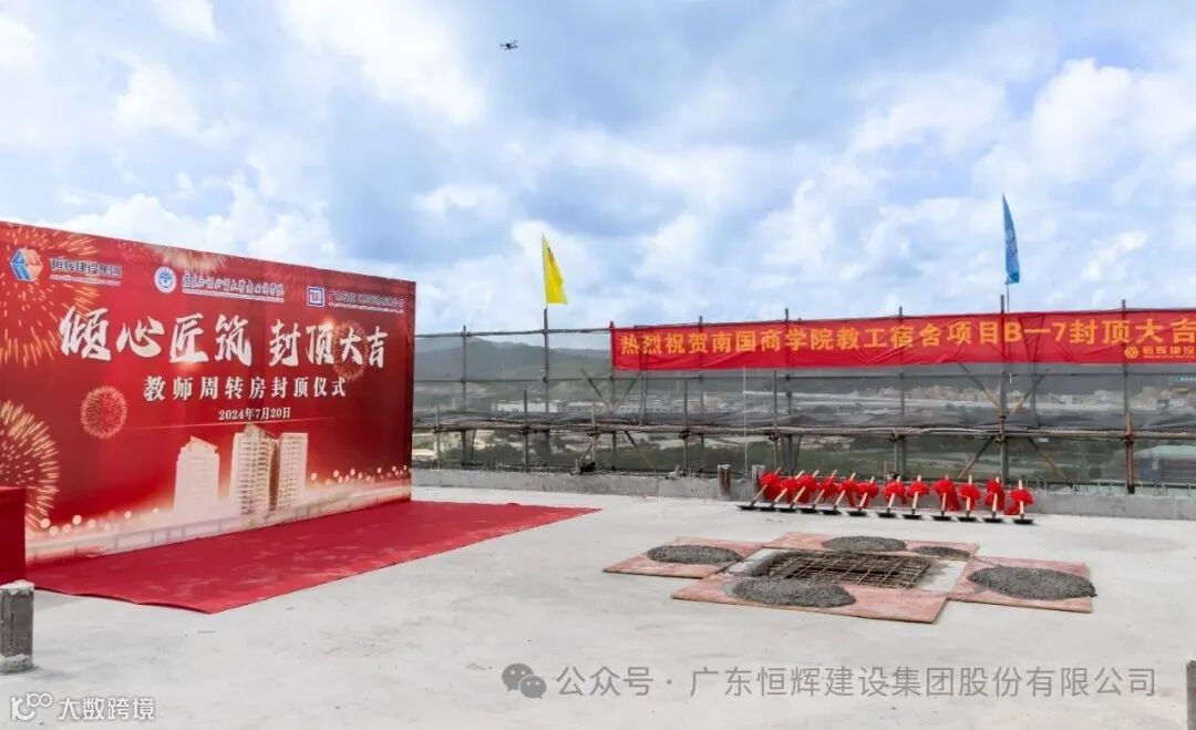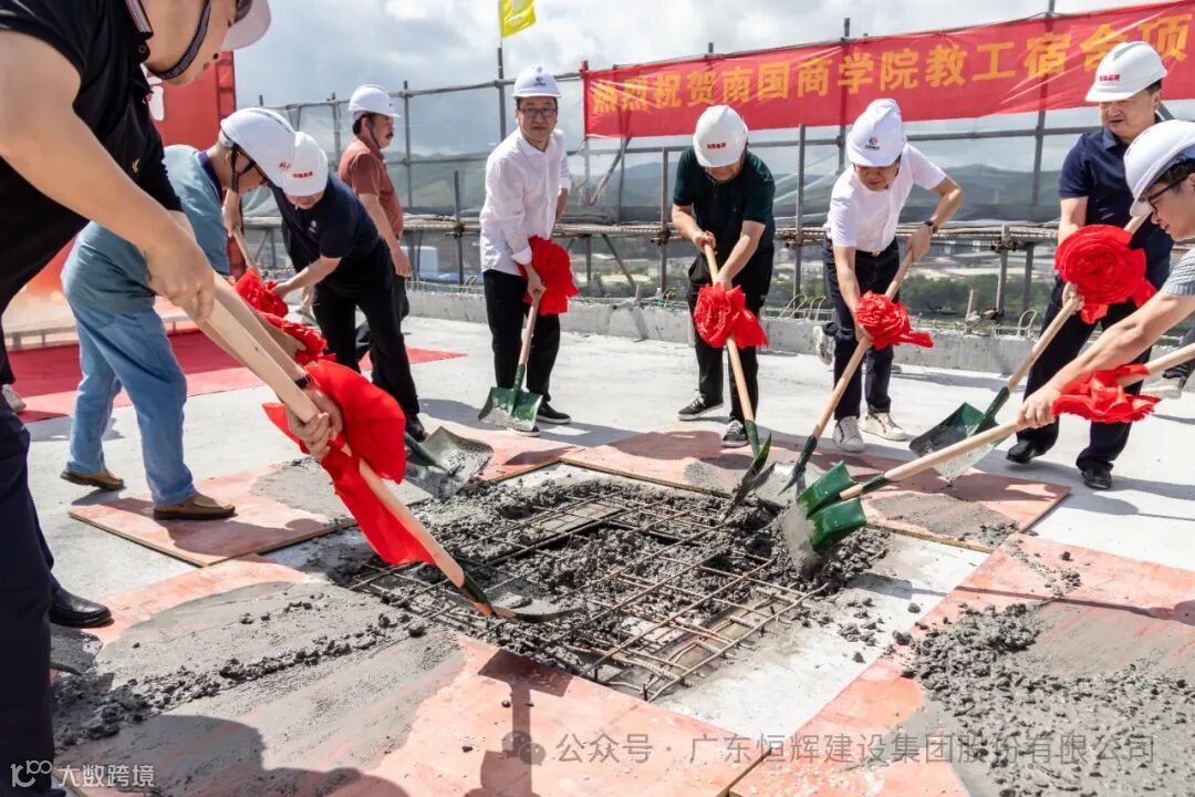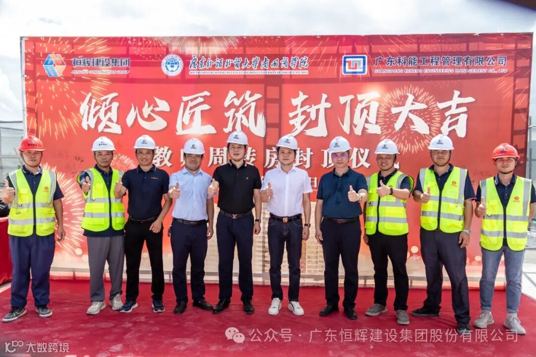 7月20日,恒辉建设集团承建的“广东外语外贸大学南国商学院教工宿舍项目”举行主体结构封顶仪式。学校董事长丁小军、副校长赖志利、基建处处长周平锋、恒辉建设集团董事长黄伟健、总裁吴国涛、执行总裁梁裕忠及监理、设计单位等几十人见证这一重要时刻!