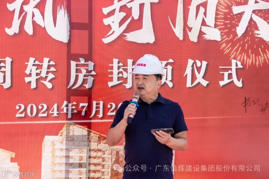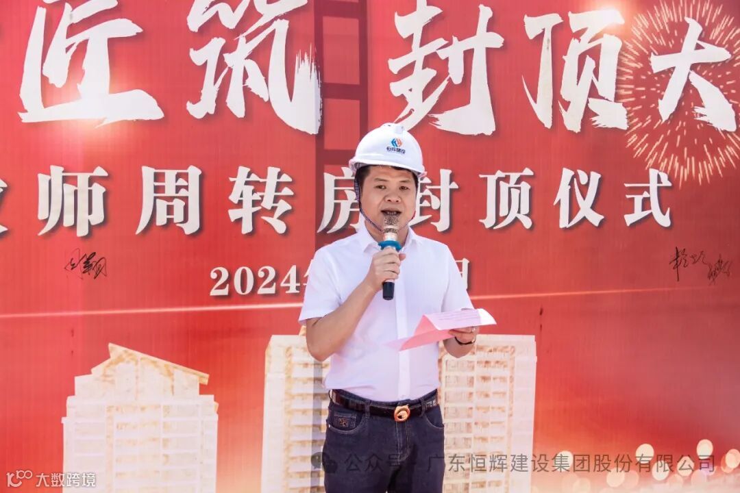 恒辉建设集团董事长黄伟健代表施工总承包单位介绍项目情况并致辞。他指出,项目从立项到今天的主体结构封顶,每一步都离不开学校领导、监理、设计等各方单位的大力支持。在工期紧、任务重的情况下,恒辉建设集团攻坚克难,顺利完成了2024年工程重要节点。南国商学院项目部将以此为新起点,确保后续工程按照既定目标高质量、高效率地完成,将项目打造成教育标杆工程、优质工程。同时,确保2025年1月将二期全部交付学校,2025年8月四期项目顺利竣工并交付使用,为学校、教育及社会交上一份满意的答卷!