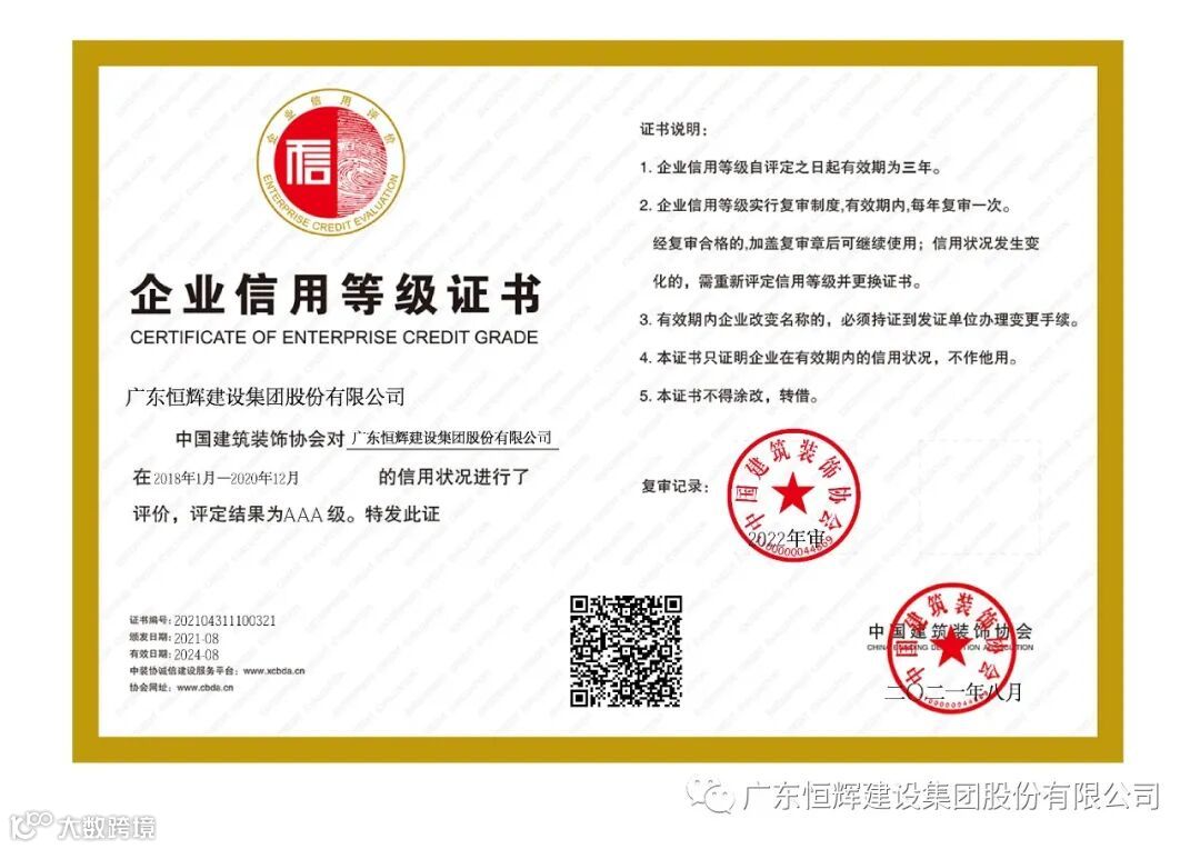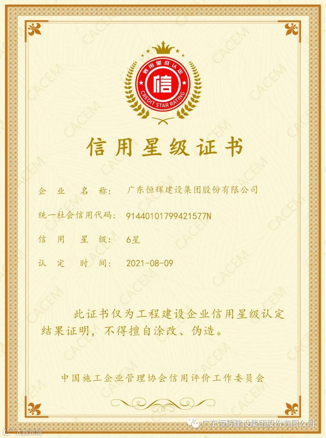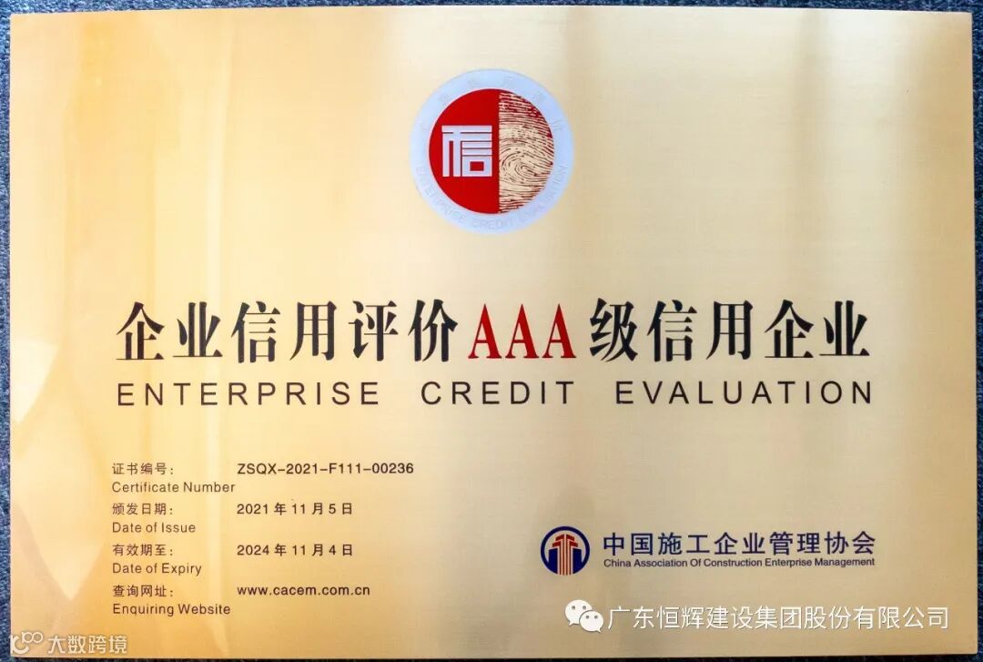 此次获评是恒辉建设数十年来诚信经营的集中体现,意味着集团公司的履约能力、企业信誉、文化建设、社会责任等综合实力得到了行业和市场的进一步认可。同时将为集团在市场准入、招标投标、评先评优等方面发挥积极的作用,将进一步提升集团品牌影响力。