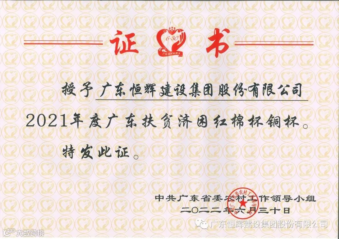 近日,广东扶贫济困日活动办公室公布“广东扶贫济困红棉杯”获奖名单。恒辉建设集团凭借在助力乡村振兴、东西部协作等方面作出的突出贡献,首次荣获“广东扶贫济困红锦杯铜杯奖”。