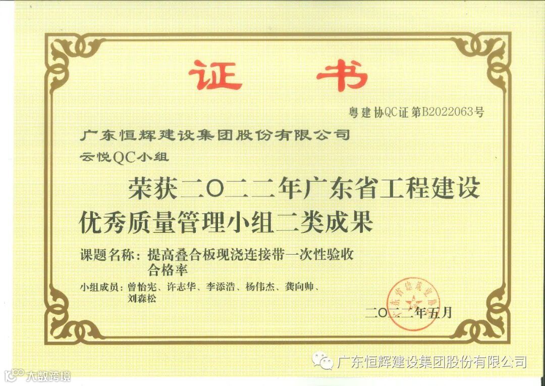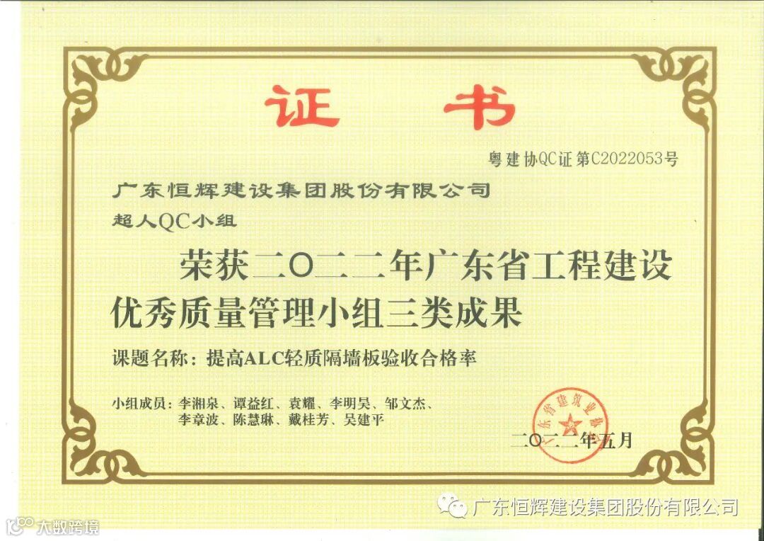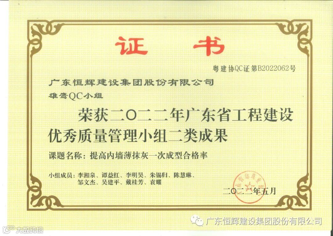“雄鹰QC小组”课题研究使得内墙薄抹灰一次验收合格率从81.4%提升至96.7%,叠合板现浇连接带一次性验收合格率从79.58%提升至93.75%,解决了业主和监理最担心的内墙薄抹灰施工质量问题,减少了叠合板连接带成型不合格的缺陷,得到了业主及监理单位的一致好评,该课题也分别获得“广州市建设行业质量管理小组活动一等奖、二等奖”。
