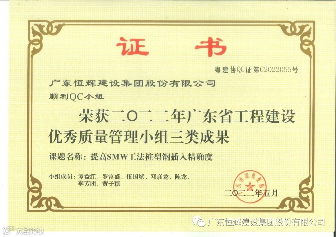 此项目运用了QC小组的成果,使得SMW工法桩型钢插入精确度要高于94%,有效节约了工期和人工费、材料费,创造了可观的经济效益。提高了我司的施工信誉。该课题也曾获得“广州市建设行业质量管理小组活动三等奖”。