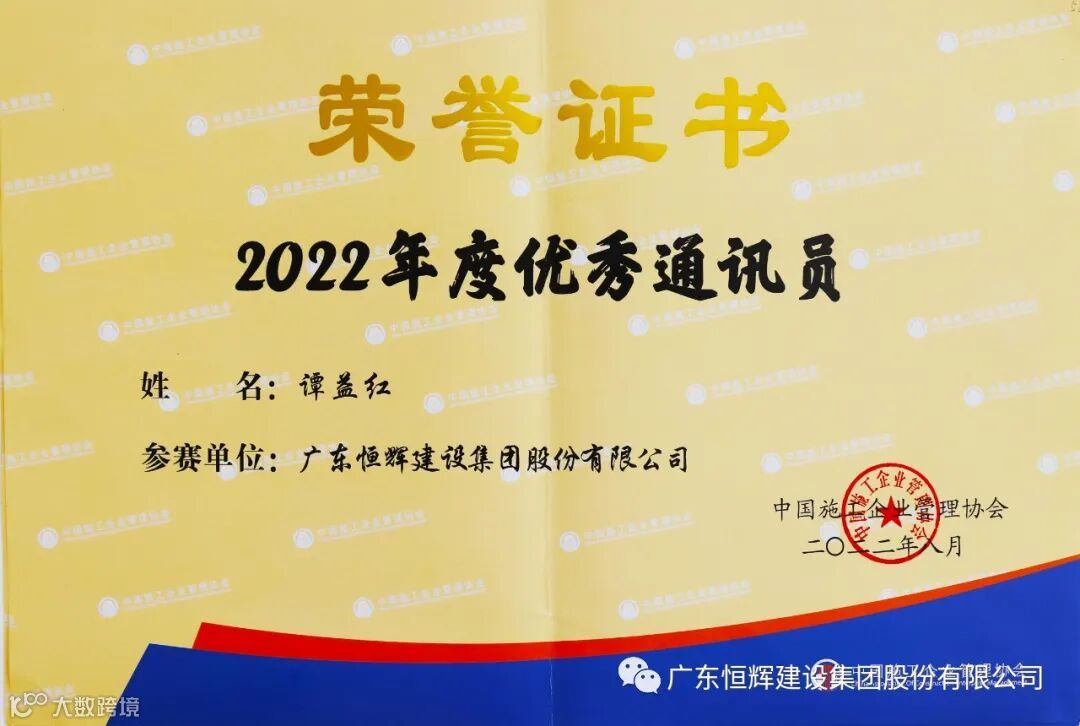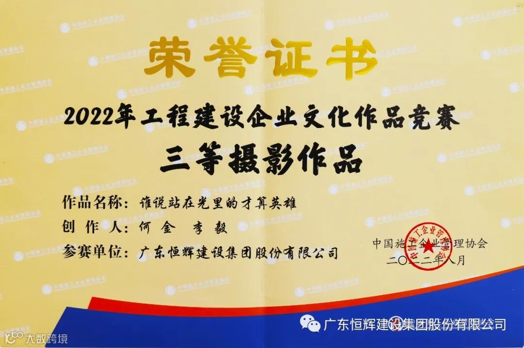 9月6日,由中国施工企业管理协会主办的2022年工程建设行业文化大会在南宁召开,公布了2022年度工程建设企业文化作品竞赛名单,恒辉建设集团共有三项作品获得奖项,其中,创优经理谭益红被评为优秀通讯员、摄影作品《谁说站在光里的才算英雄》、《筒体》荣获三等奖。