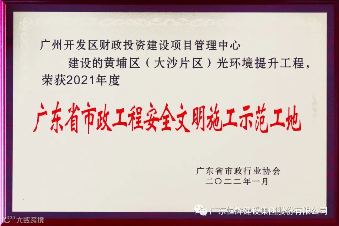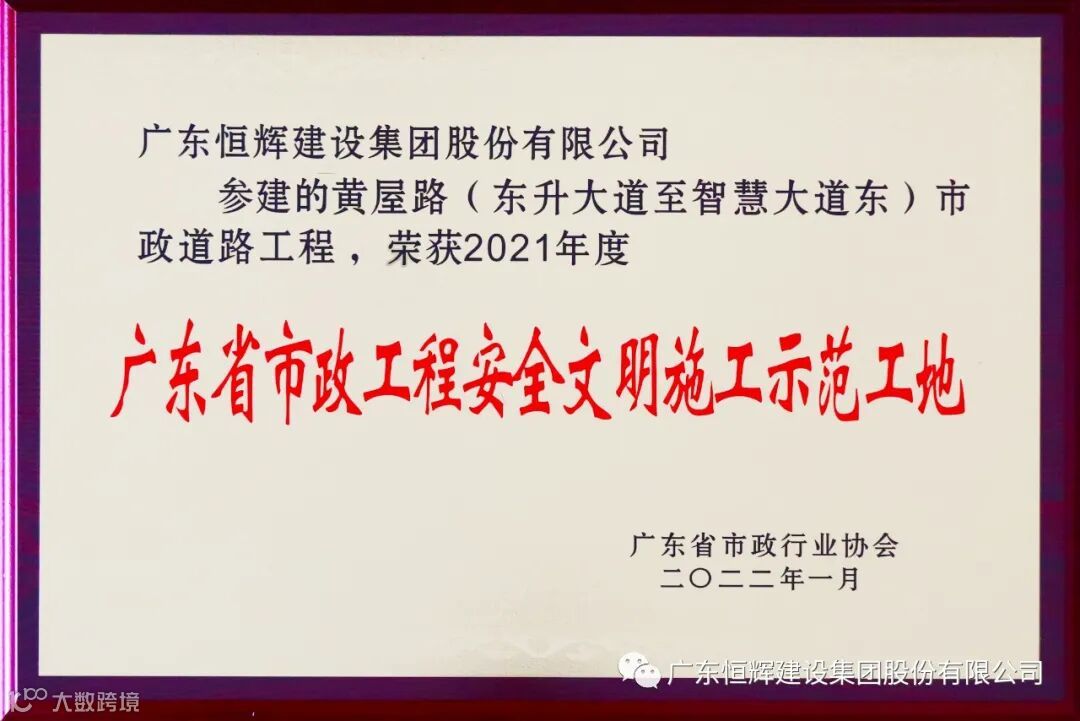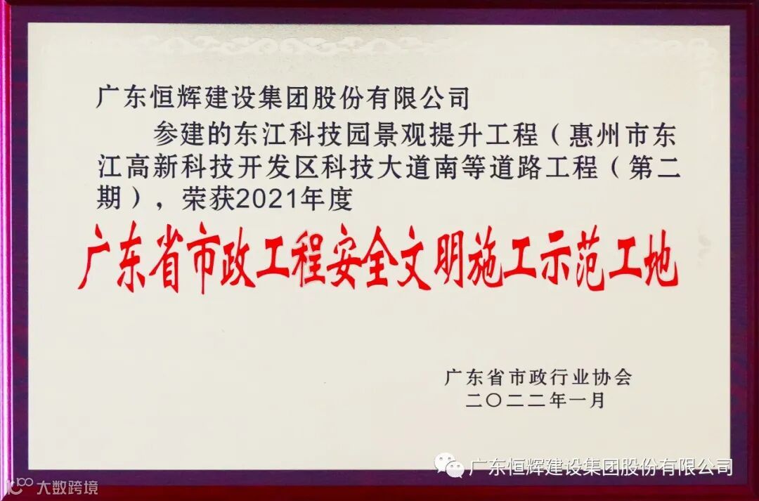 由恒辉建设集团承建的黄埔区(大沙片区)光环境提升工程、仲恺高新区智能终端产业园二路、黄屋路(东升大道至智慧大道东)市政道路、东江科技园景观提升道路均获得“2021年度广东省市政工程安全文明施工示范工地”。