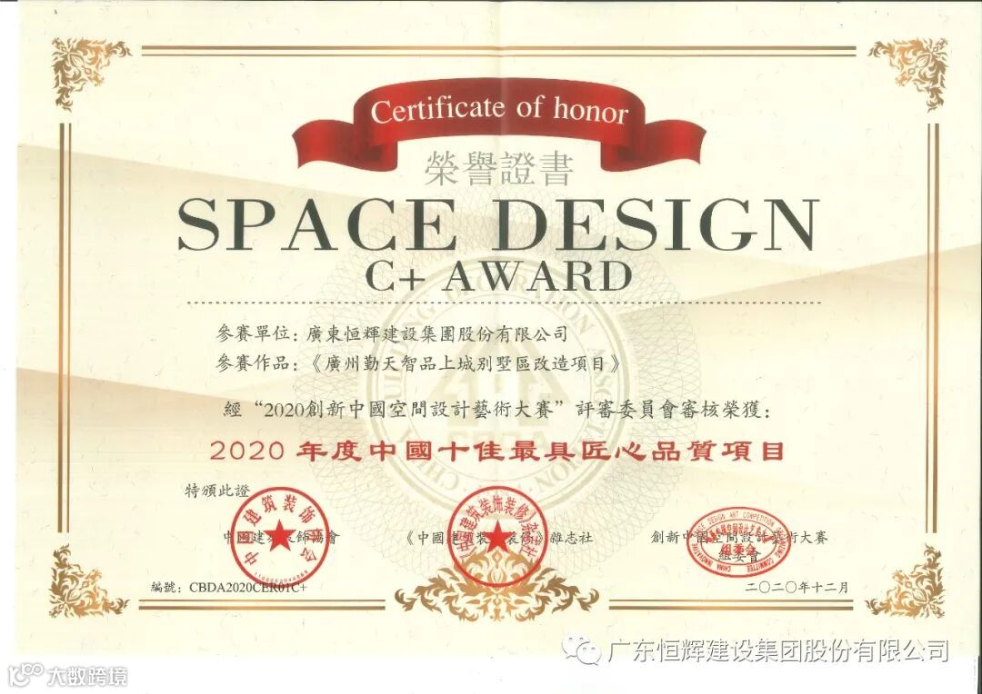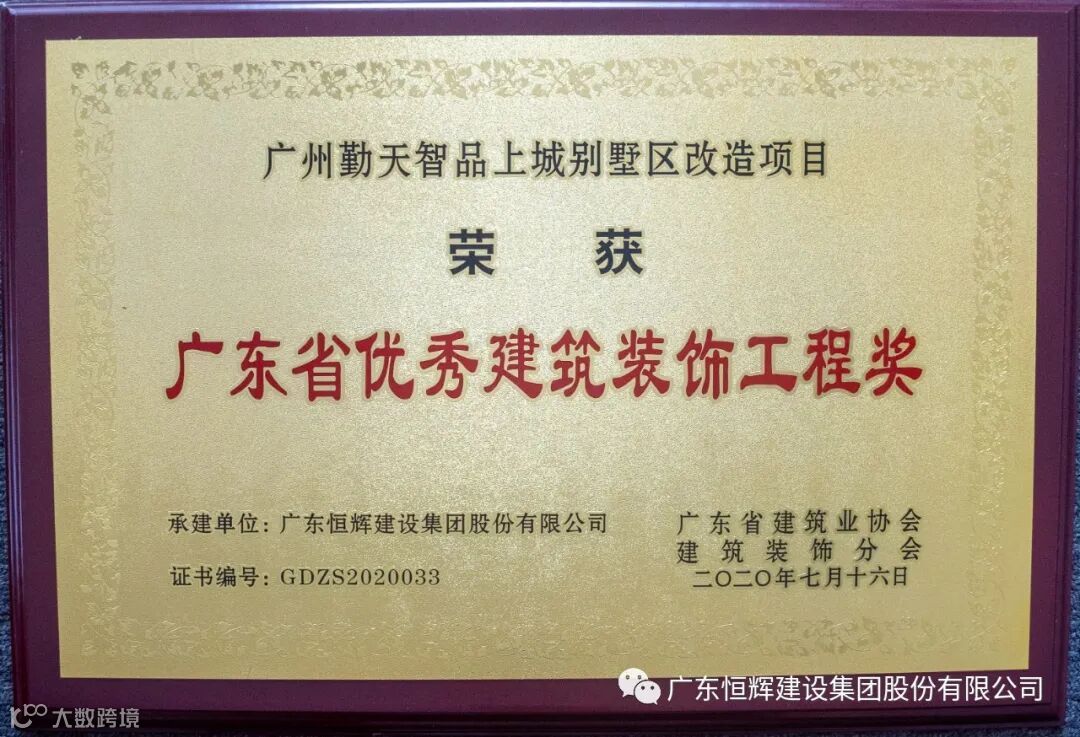 打铁还需自身硬,无须扬鞭自奋蹄。恒辉建设集团多年来不断提升自身建筑装饰专业一体化综合服务水平,发扬技术与行业优势,在装配创新研发、建造标杆项目等多个板块为广大客户持续输出专业服务。由恒辉建设集团承建的“广州勤天智品上城别墅区改造项目”荣获“2020年度中国十佳最具匠心品质项目”、“广东省优秀建筑装饰工程奖”、“广州市建筑装饰优质工程奖”;承建的“广州南沙明珠湾开发大厦项目”荣获“广东省优秀建筑装饰工程奖”等多个国家级省市级奖项。