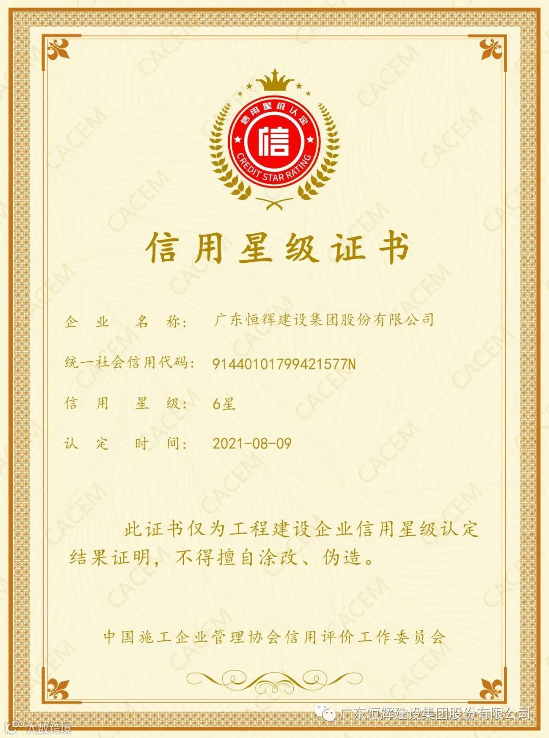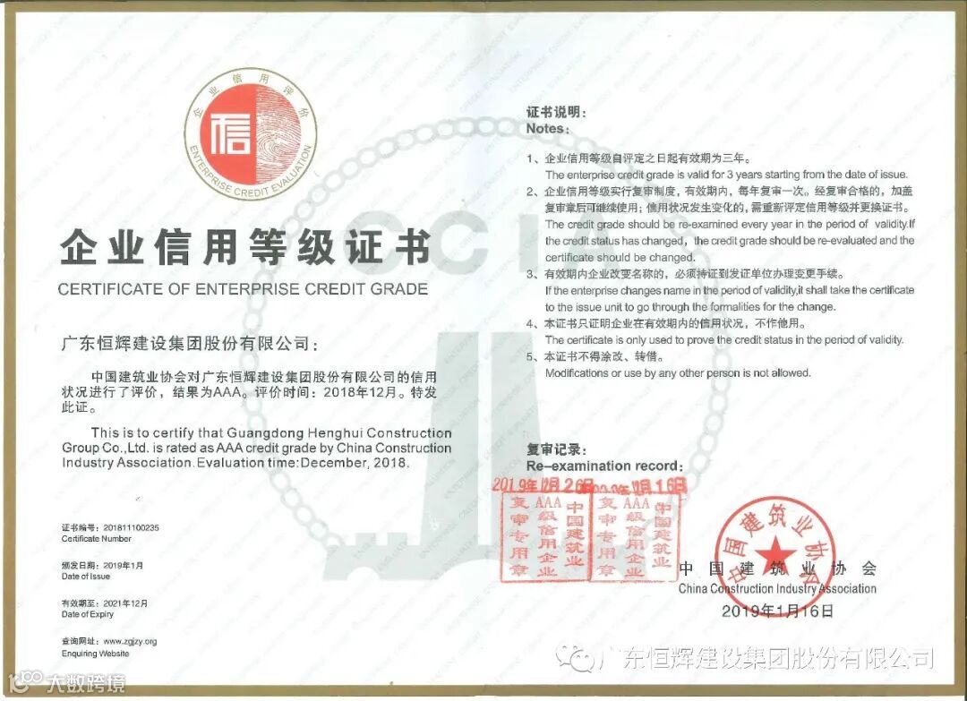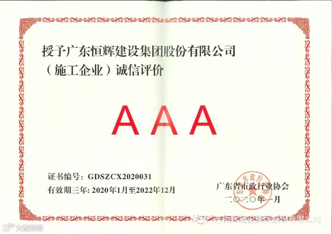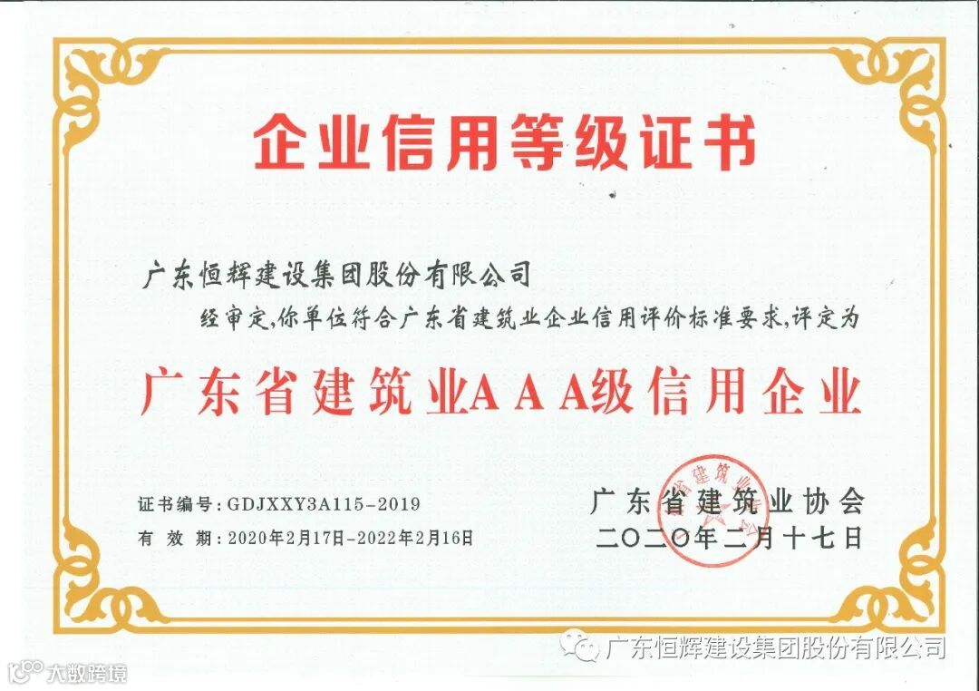 近年来,恒辉建设持续践行“诚信第一、优质履约”的经营理念,积极深化企业信用建设,已先后获得“2021年度全国工程建设信用六星级企业”、“2021年度全国建筑装饰协会AAA信用企业”、“广东省施工企业诚信评价AAA企业”等多项国家级、省市级荣誉。