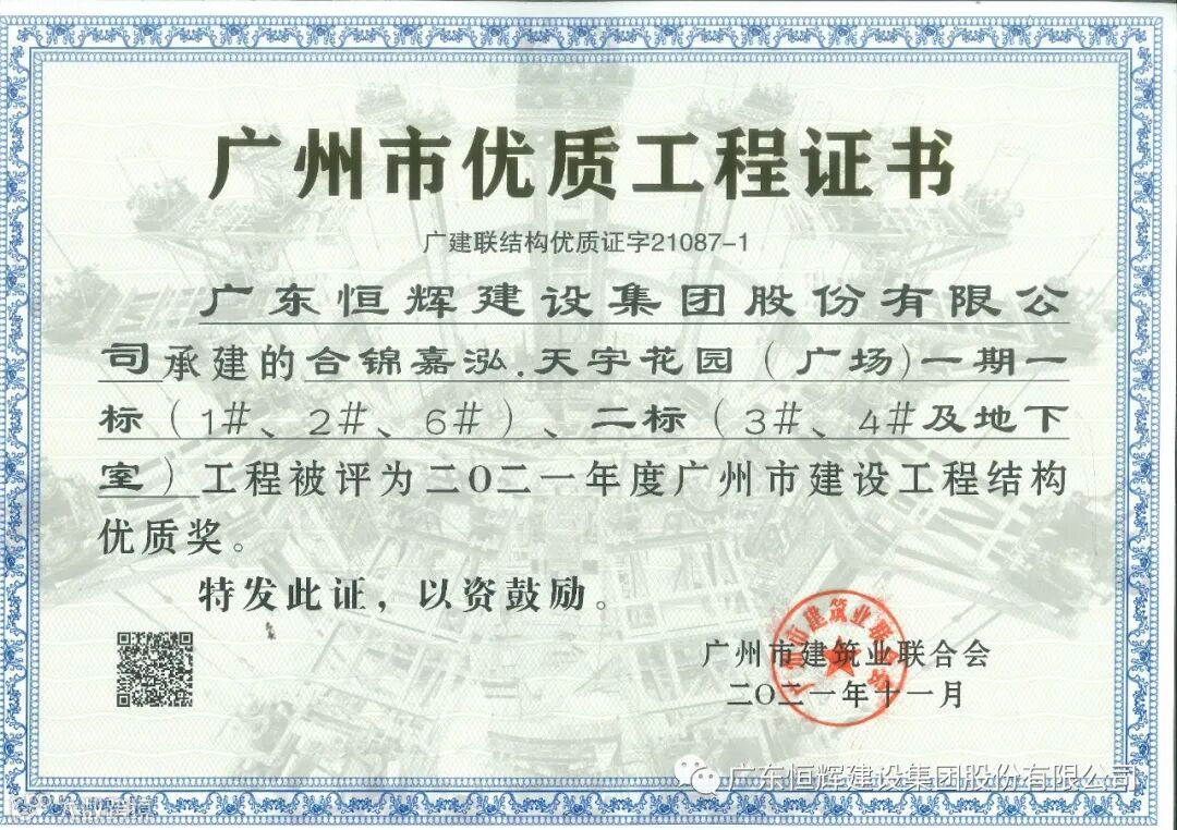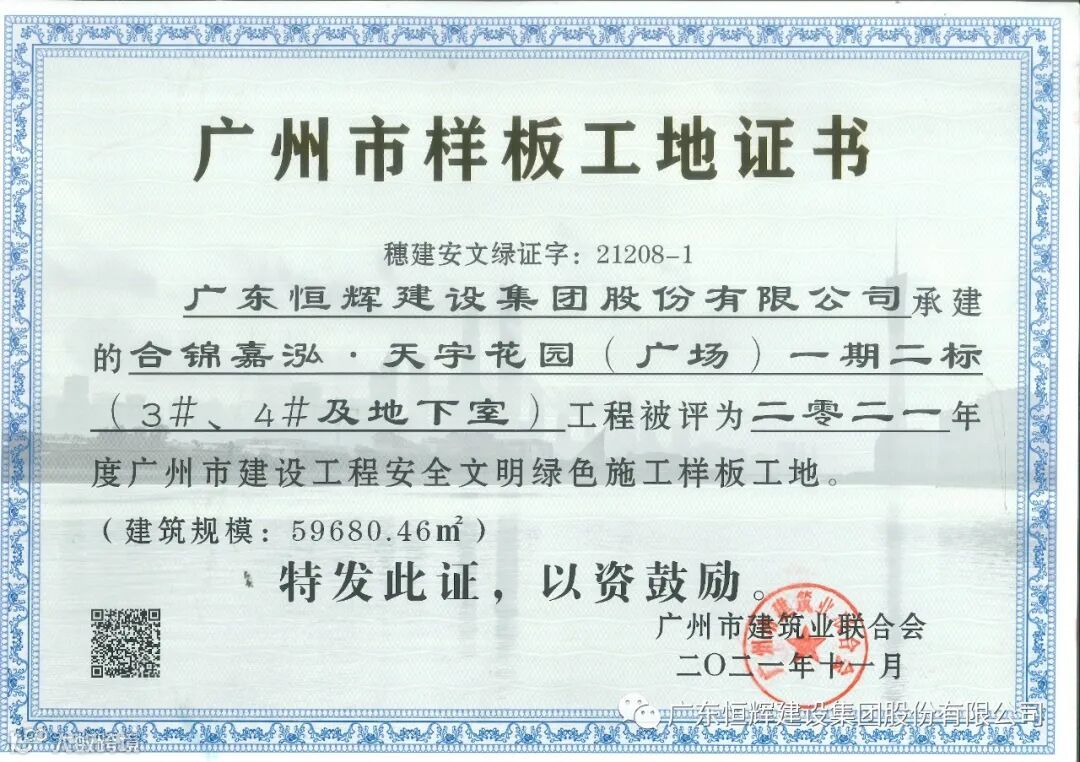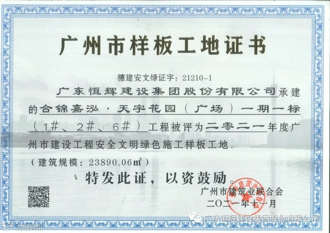 随后,广州市建筑业联合会发布通告《关于表彰2021年广州市建设工程安全文明绿色施工样板工地评选的通报》, 合锦嘉泓·天宇花园工程一期一标、二标均被评为「2021年度广州市建设工程安全文明绿色施工样板工地」以及「2021年度广州市建设工程结构优质奖」。