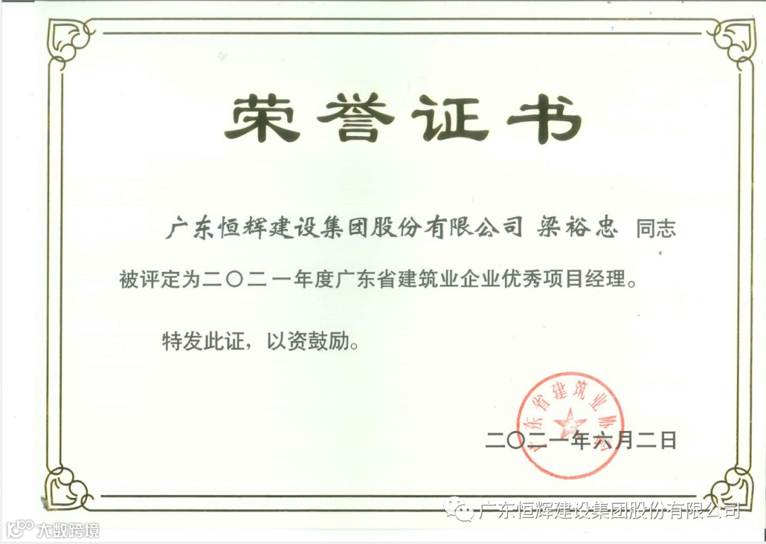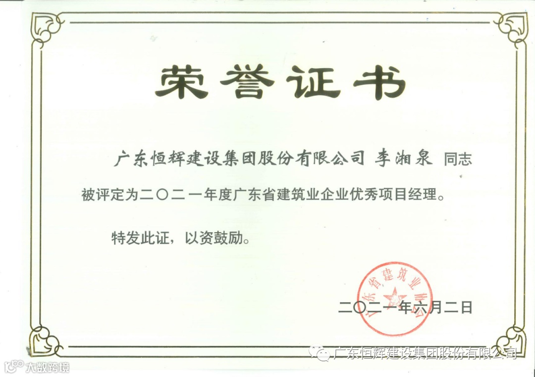 同时,省建筑业协会根据《广东省建筑业企业优秀项目经理评选办法(2020年修订)》的要求,组织专家对个人申报资料进行了评审,经评审委员会审定和网上公示,恒辉建设集团副总经理梁裕忠、总工程师李湘泉被评定为“2021年度广东省建筑业企业优秀项目经理”。