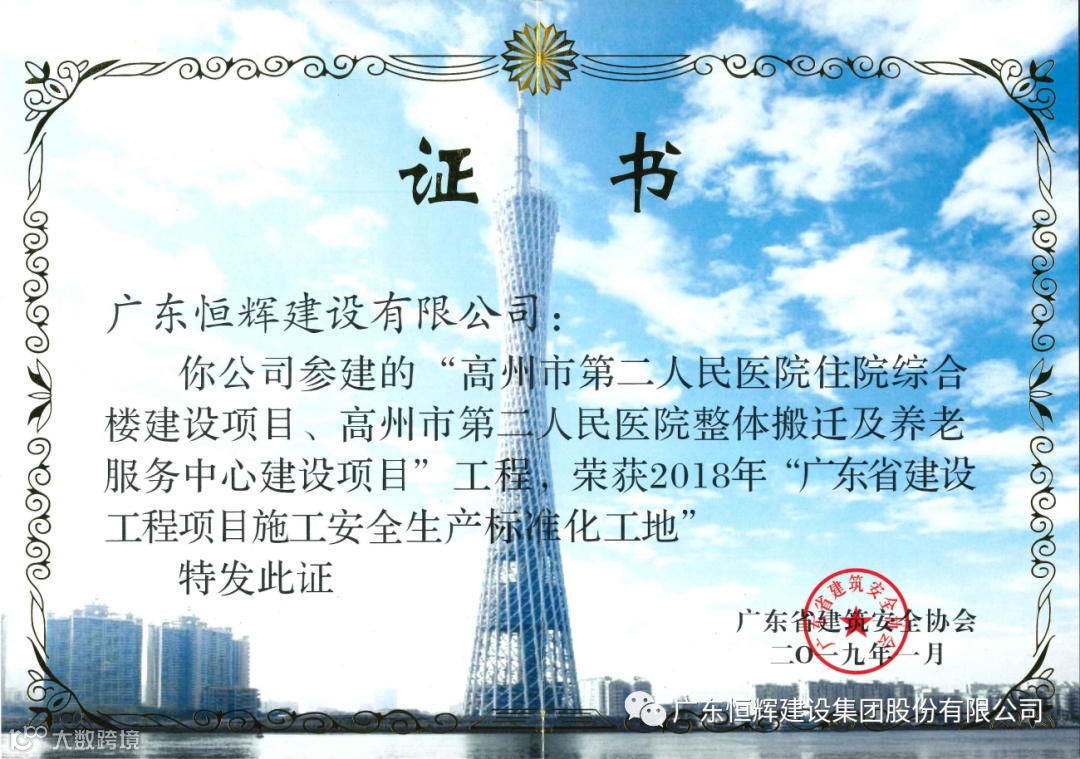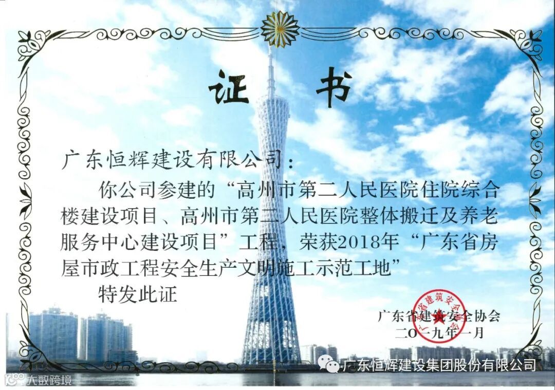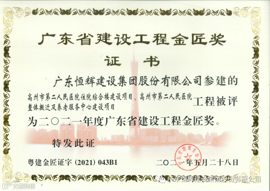 经审定,将评审最终结果予以公示。由恒辉建设集团承建的广州南沙2012NJY-2地块项目、高州市第二人民医院住院综合楼建设、医院整体搬迁及养老服务中心建设项目分别获得“2021年度广东省建设工程优质奖”、“2021年度广东省建设工程金匠奖”。