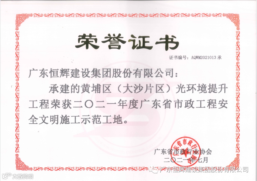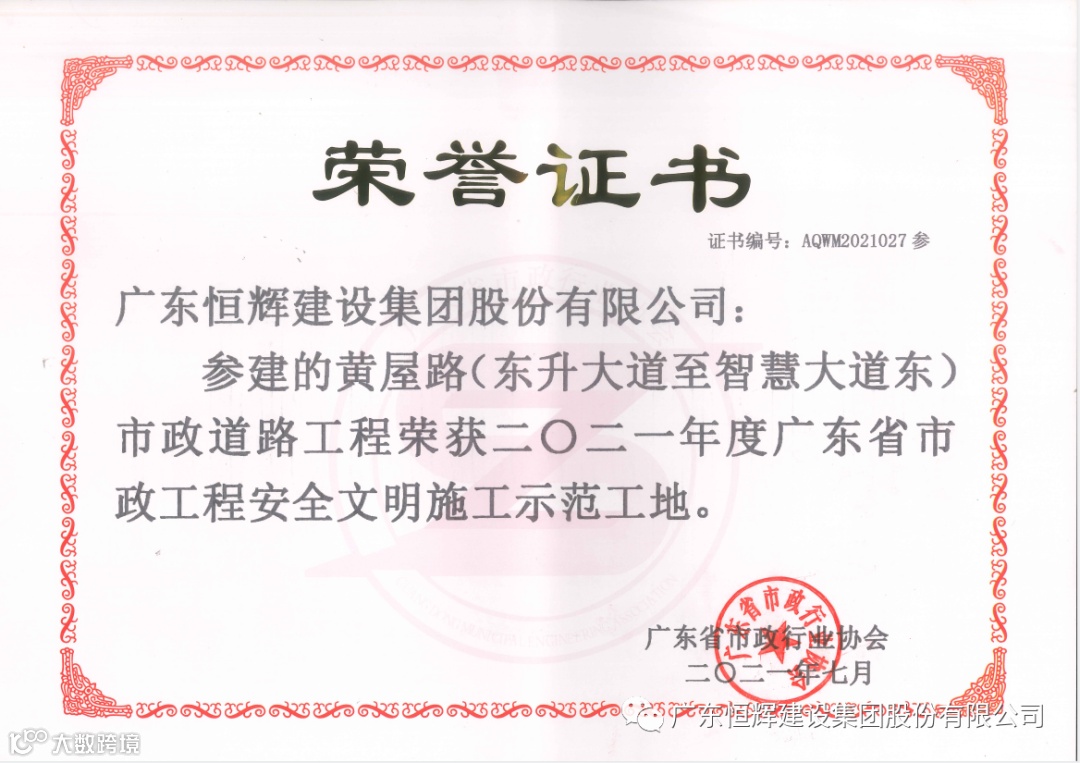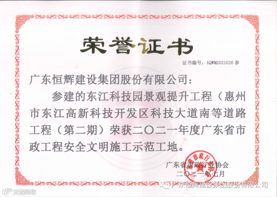 同时,由恒辉建设集团承建的黄埔区(大沙片区)光环境提升工程、仲恺高新区智能终端装备制造产业园产业二路工程(新陈大道至潼侨大道)、东江科技园景观提升工程(惠州市东江高新科技大道南)、黄屋路(东升大道至智慧大道东)市政道路等四个项目均获得“2021年度广东省市政工程安全文明施工示范工地 ”。
