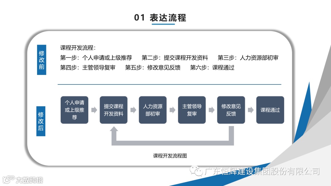 第二部分,邓锦慧讲解了各类字体的特点及其使用场合,并实操演示了外边框修饰、图文结合、纯文字PPT美化等多种文字效果制作方法。其中,在讲解纯文字PPT美化技巧时,给大家展示了未美化前一大段文字堆砌在一起的页面,并让同事们谈谈自己的感受,面对这样一页PPT大家一致觉得读不下去也无法找到重点。