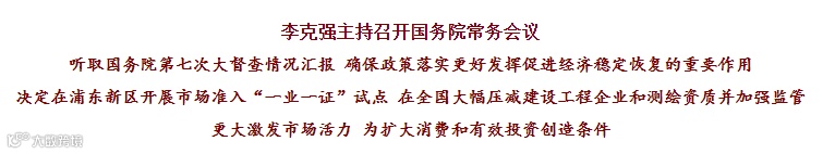 国务院总理李克强11月11日主持召开国务院常务会议,听取国务院第七次大督查情况汇报,确保政策落实,更好发挥促进经济稳定恢复的重要作用;决定在浦东新区开展市场准入“一业一证”试点,在全国大幅压减建设工程企业和测绘资质并加强监管,更大激发市场活力,为扩大消费和有效投资创造条件。