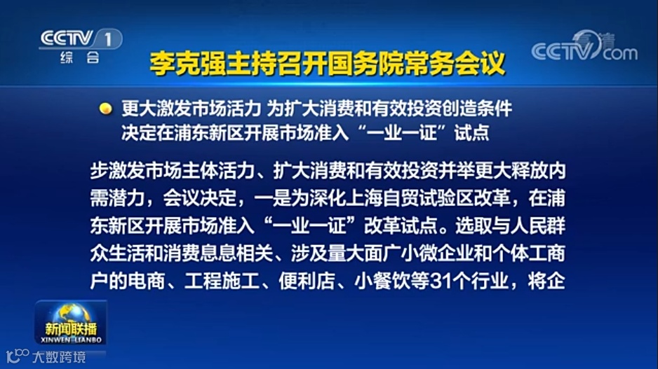 会议指出,今年经济较快实现恢复性增长,很重要的是,既围绕解决市场主体困难实施宏观纾困政策,又对接市场主体需求以改革优化营商环境,二者相辅相成。着眼进一步激发市场主体活力、扩大消费和有效投资并举更大释放内需潜力,会议决定,一是为深化上海自贸试验区改革,在浦东新区开展市场准入“一业一证”改革试点。选取与人民群众生活和消费息息相关、涉及量大面广的小微企业和个体工商户的电商、建设工程施工、便利店、小餐饮、健身房、书店、电影院等31个行业,建立综合许可制度,将企业需要办理的多张许可证整合为一张行业综合许可证,过去由国务院部门实施的25项许可等事项改为委托浦东新区受理和发证,实现市场主体“一证准营”、全国范围有效。同时,建立信息共享、协同高效的行业综合监管制度,减少执法扰民,提升监管效能。试点要总结经验,成熟后向全国推广。二是针对建设工程企业和测绘资质类别过细、等级过多、准入门槛高手续繁等问题,将工程勘察、设计、施工、监理企业资质类别和等级由593项减至245项,除最高等级综合资质和需跨部门审批的资质外,将其他等级资质一律下放至省级及以下部门审批;将测绘资质类别和等级总数由138项减至20项,除导航电子地图制作外,将其余甲级测绘资质审批全部下放至省级。同时,加强事中事后监管,严格执行“黑名单”制度,对工程质量安全问题突出的依法依规严肃惩戒,落实工程质量终身责任制,确保建设工程质量安全,促进测绘行业健康发展。