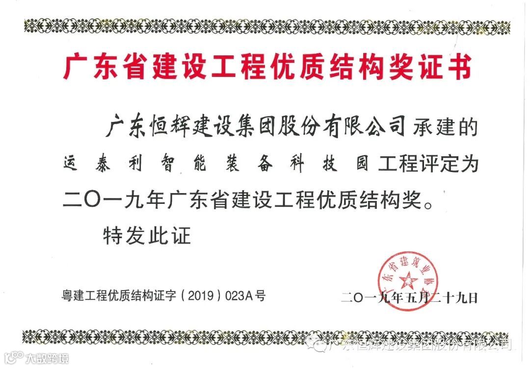 目前,恒辉建设集团承建的“珠海市运泰利智能装备科技园”项目和“珠海市香洲区容国团小学”项目已分别获得“2019年度广东省建设工程优质结构奖”和“2020年上半年珠海市房屋市政工程安全生产文明施工示范工地”(奖牌正在制作中)。