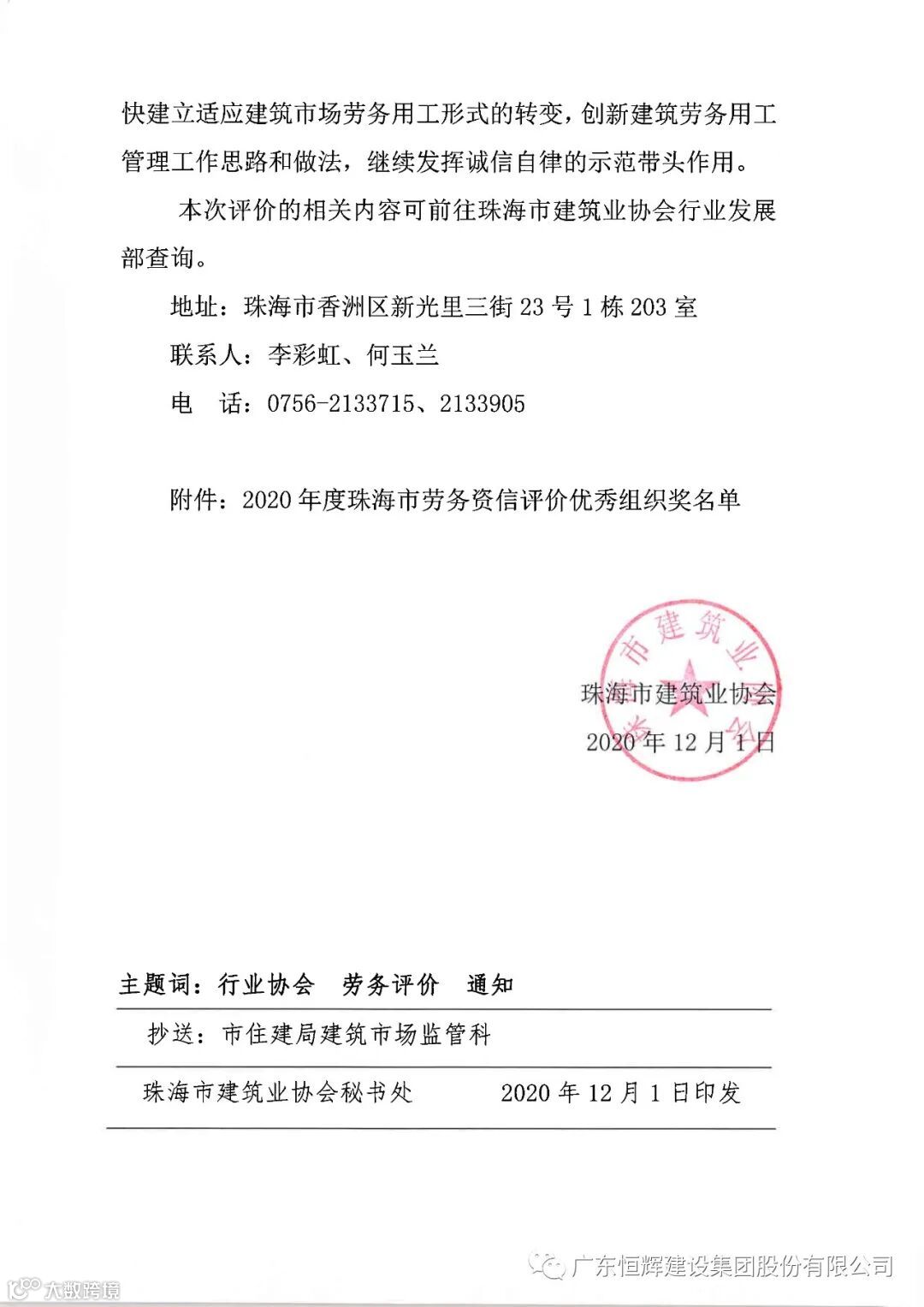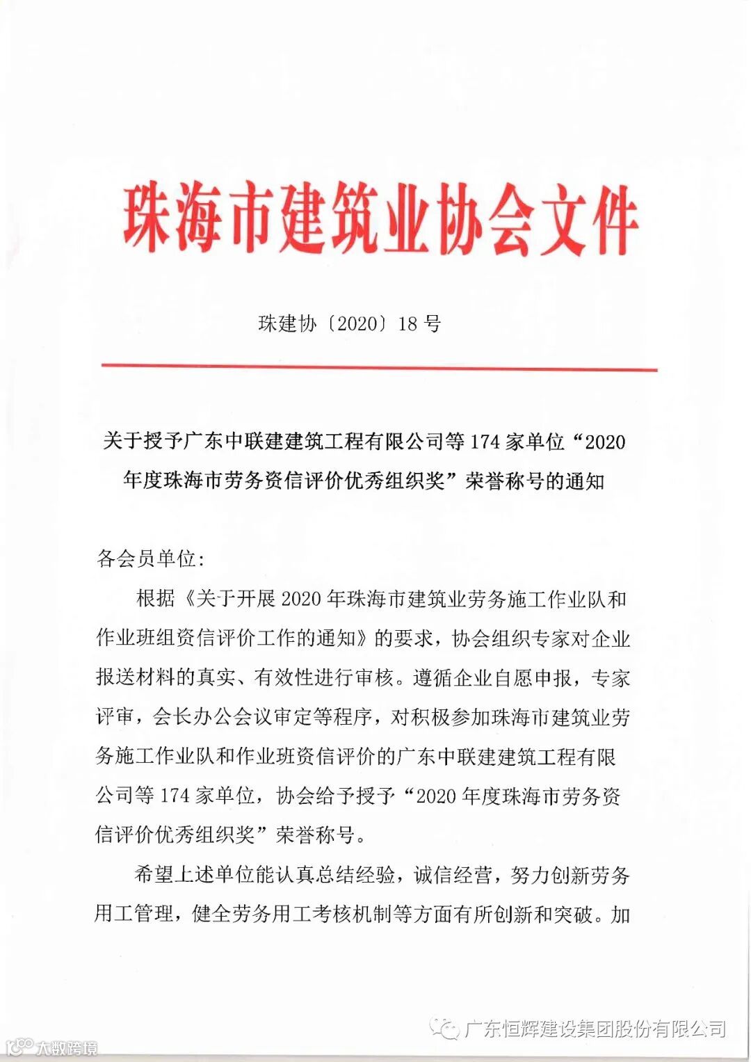 品牌是市场的通行证。继2018年、2019年,集团已经连续三年获得“珠海市劳务资信评价优秀组织奖”荣誉称号。这不仅仅是对恒辉建设集团“质量立业、市场为先、以人为本、诚信发展”企业理念的肯定,也是对项目管理、施工质量、现场管理水平的极大认可。有利于进一步提升恒辉建设集团在广东省乃至全国的品牌影响力。