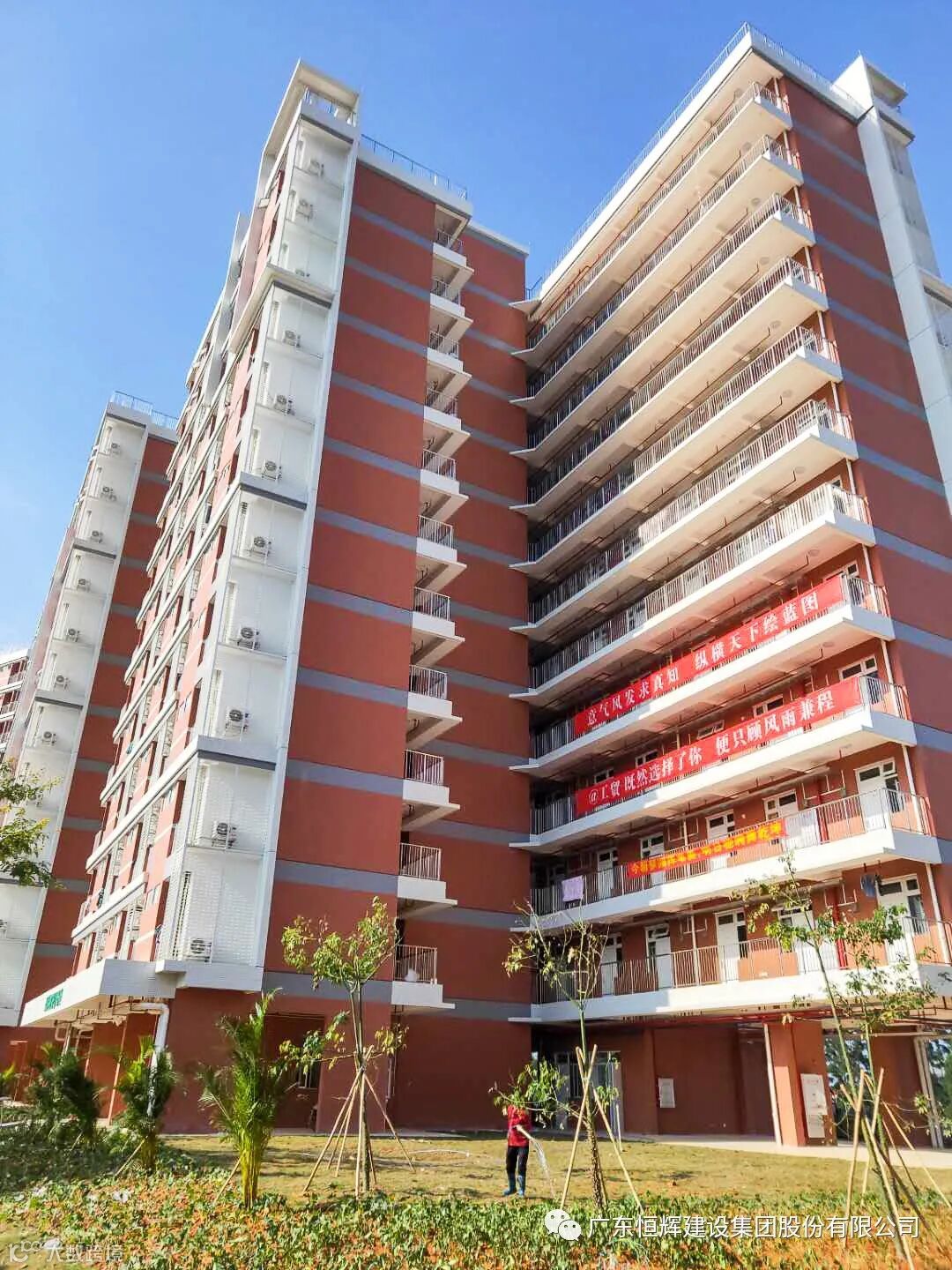 广东工贸职业技术学院学生宿舍(自编号16#)自2020年6月28日举行主体结构封顶仪式后,恒辉建设集团工贸项目部在工期紧、任务重、施工现场条件艰苦的情况下,攻坚克难,实现了项目完美收官,以优质的成绩履行了对学校和政府的承诺,打造了经得起时间、经得起社会检验的精品工程。