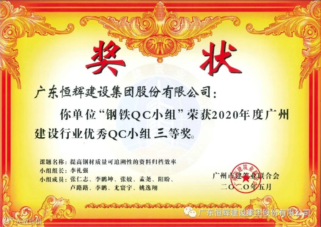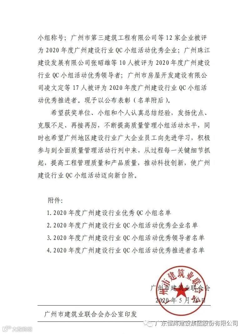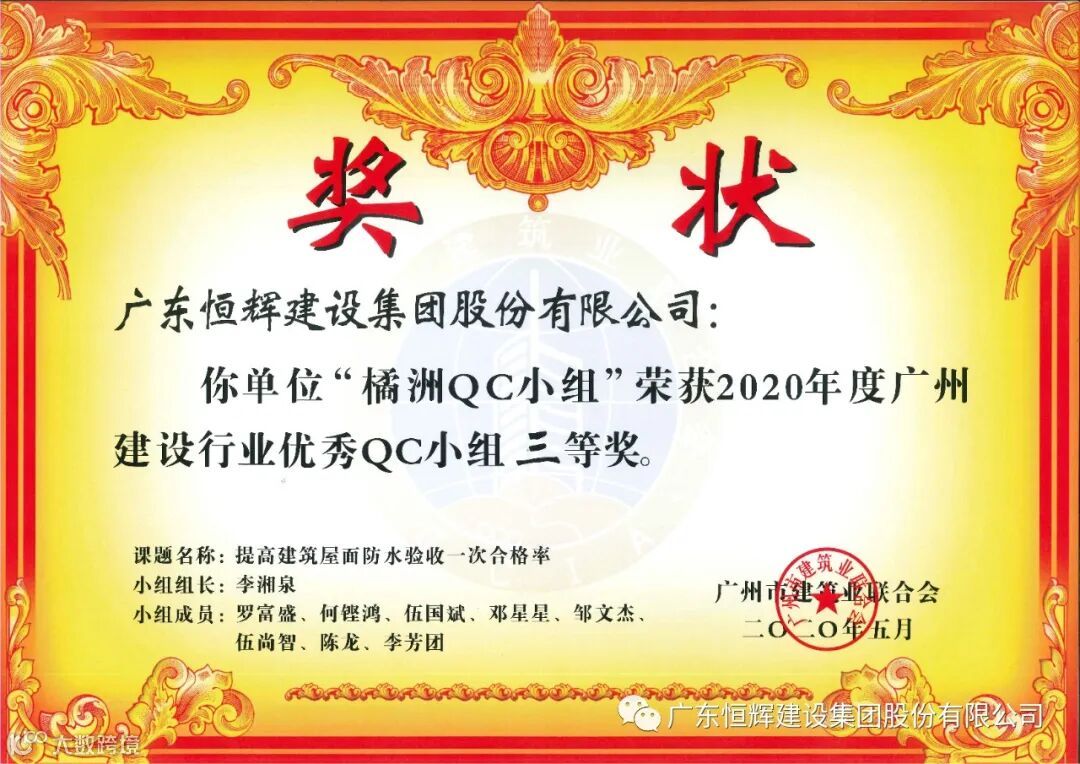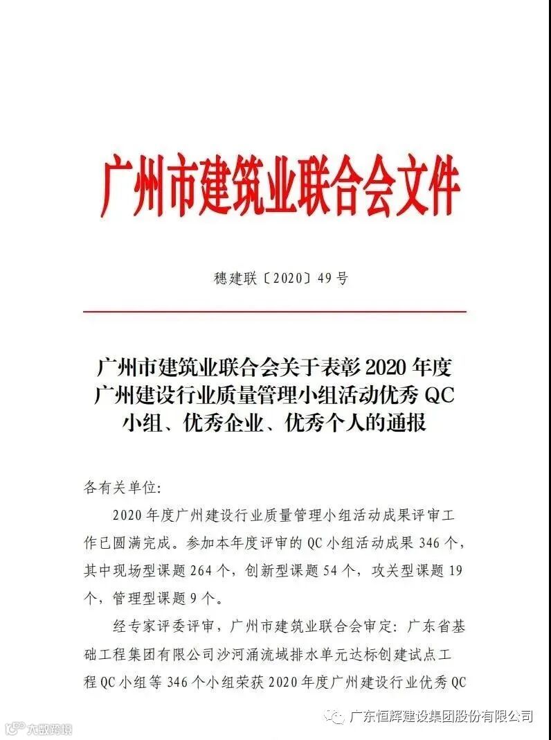 近日,广州市建筑业联合会发布了“关于表彰2020年度广州建设行业质量管理小组活动优秀QC小组”的评定结果。