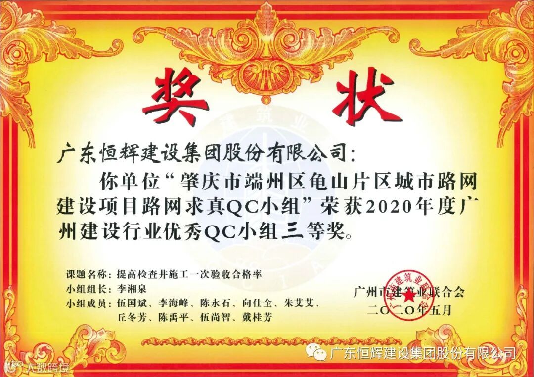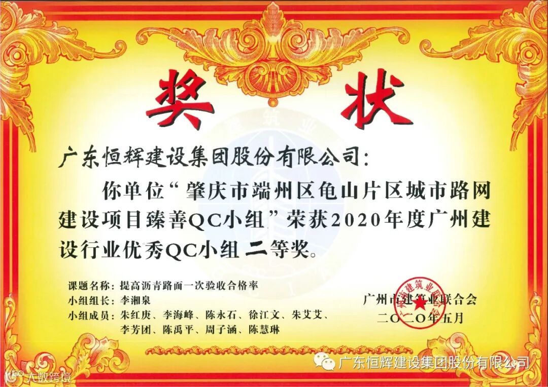 其中,肇庆市端州区龟山片区城市路网建设项目路网求实QC小组荣获“优秀QC小组一等奖。”