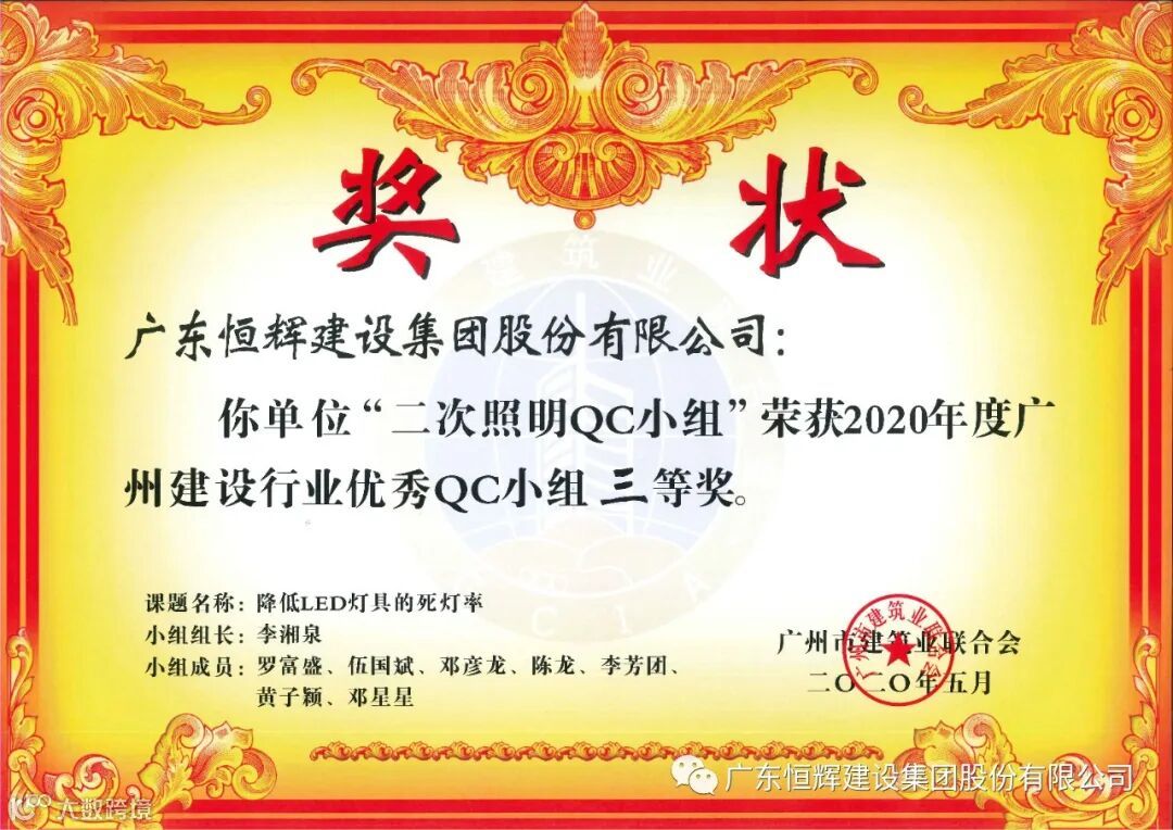 “金樾江南项目乘风破浪QC小组”、“钢铁QC小组”、“红黄蓝QC小组”、“橘洲QC小组”、“二次照明QC小组”、“端州龟山片区城市道路项目求真QC小组”、“恒建QC小组”等7项课题荣获优秀QC小组三等奖。