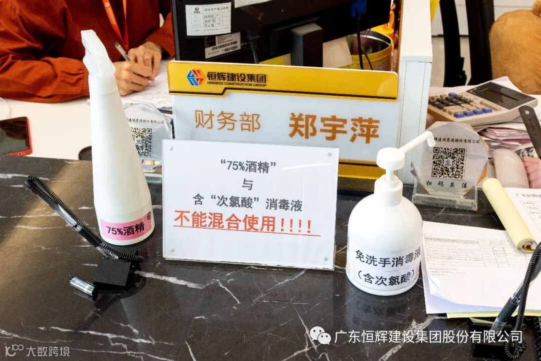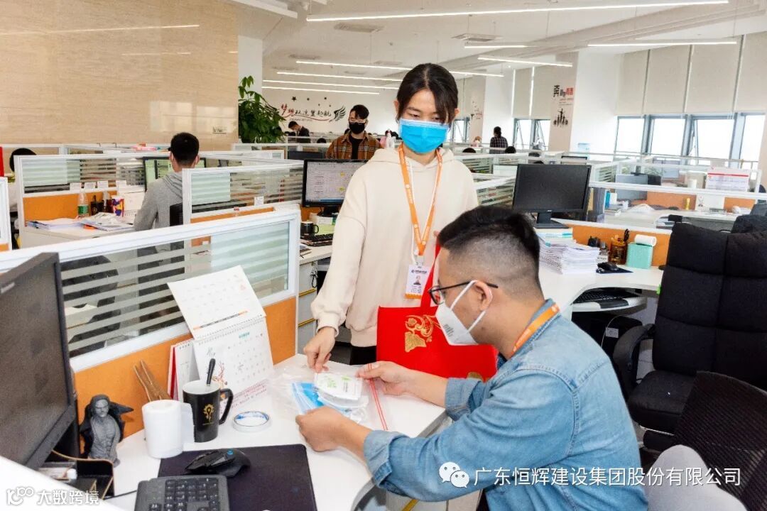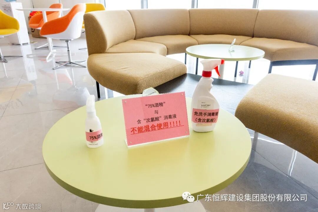 除此之外,恒辉建设集团集中力量,购买口罩、酒精、体温计等众多防控物资,分批打包,并分发给每人,保证日前复工的全面防控,办公区域随处可见消毒用品。众人防控疫情,同舟共济,攻克艰难!