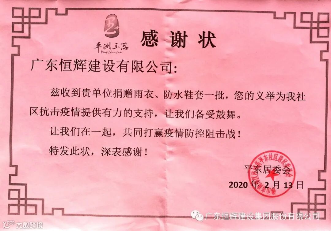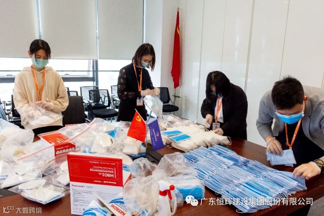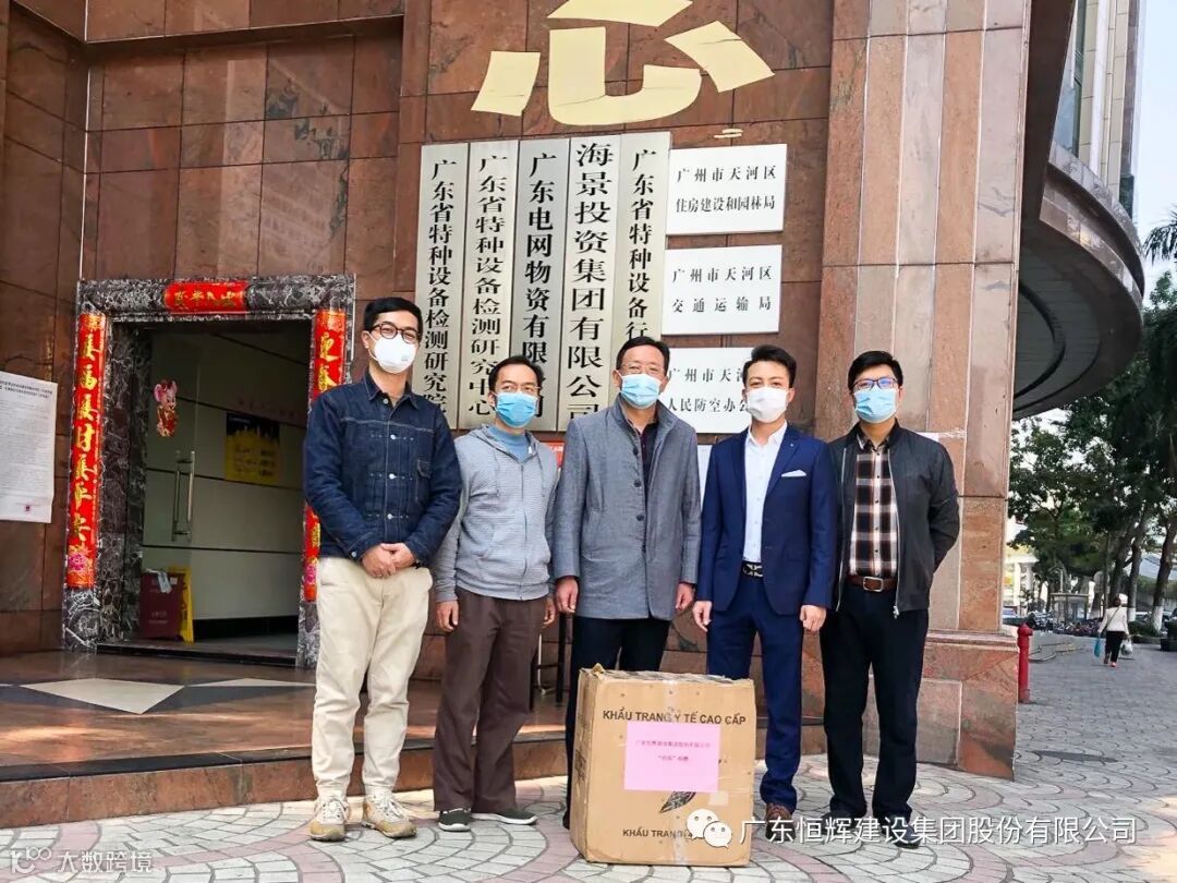 在面对国内物资紧缺的局面,集团公司与时间赛跑,积极寻找防疫资源采购渠道,通过国外众多采购渠道,筹备到大量物资,积极向广州市政府、天河区政府、社区捐赠物资,包括口罩、消毒水、测温仪、雨衣、防水鞋套、保温杯等等以及向天河区慈善总会捐款人民币十万元防控基金。捐物捐款累计已超过一百万元。后期,恒辉建设集团将继续寻求防疫物资,以实际行动助力疫情防控工作,践行企业社会责任,为武汉助力,为中国加油!