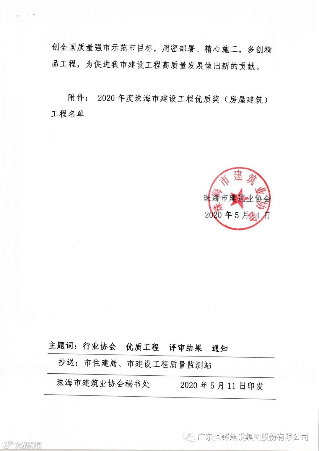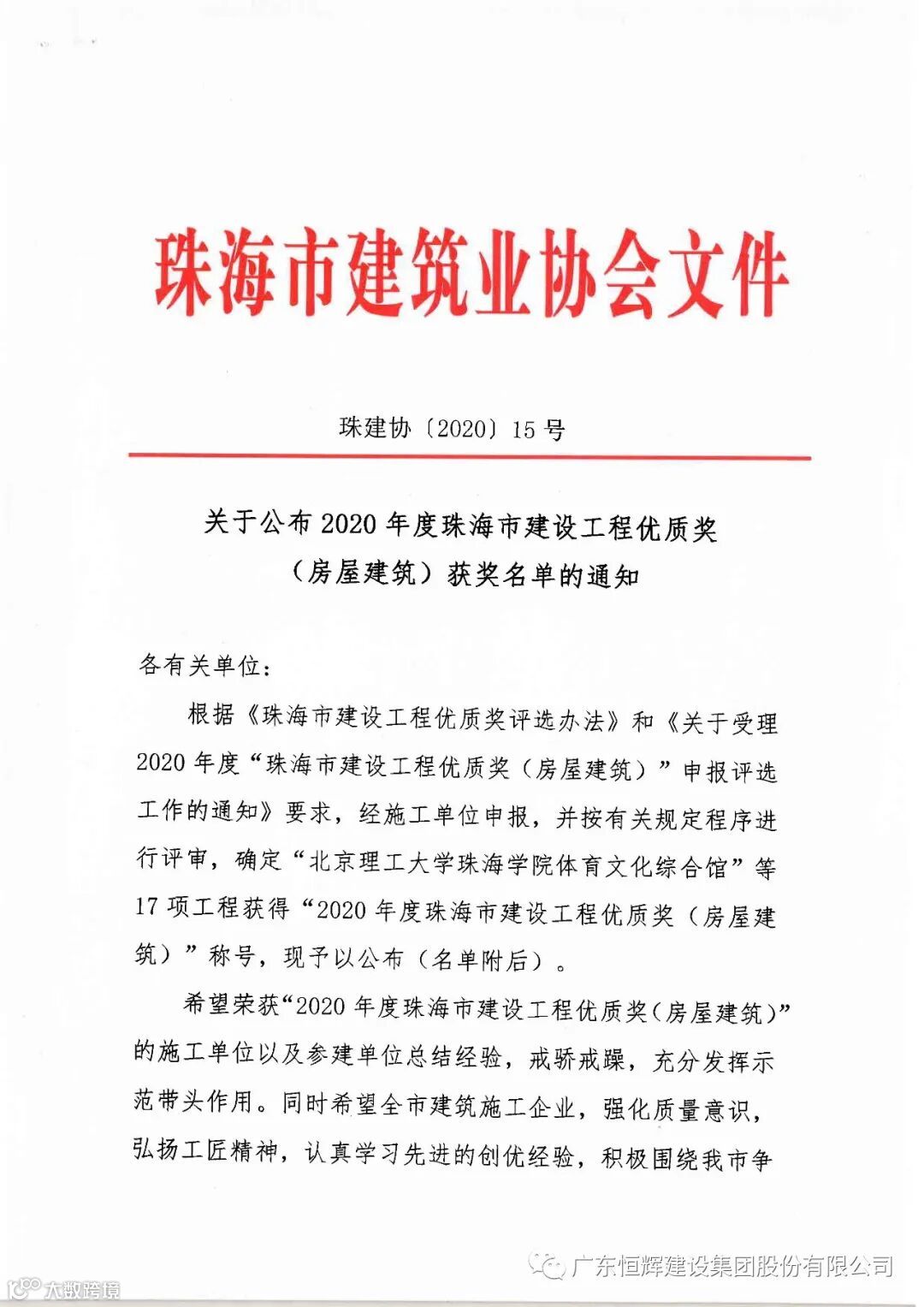 为表彰先进,树立榜样,全面提升行业整体素质,推动行业的持续健康发展。由珠海市建筑业协会组织开展的2020年度“珠海市建设工程优质奖”评选,经过近半年的行业选拔、评选、公示,昨日评选结果揭晓,由恒辉建设集团承建的“运泰利智能装备科技园”工程获得“2020年度珠海市建设工程优质奖(房屋建筑)称号”。